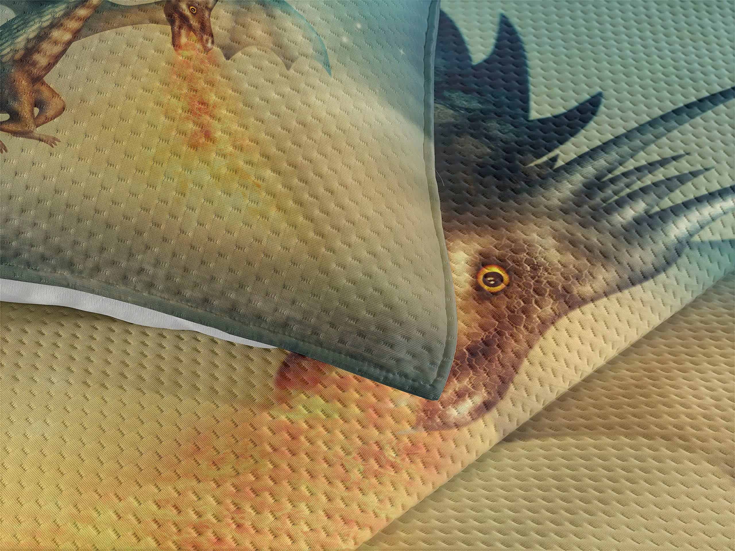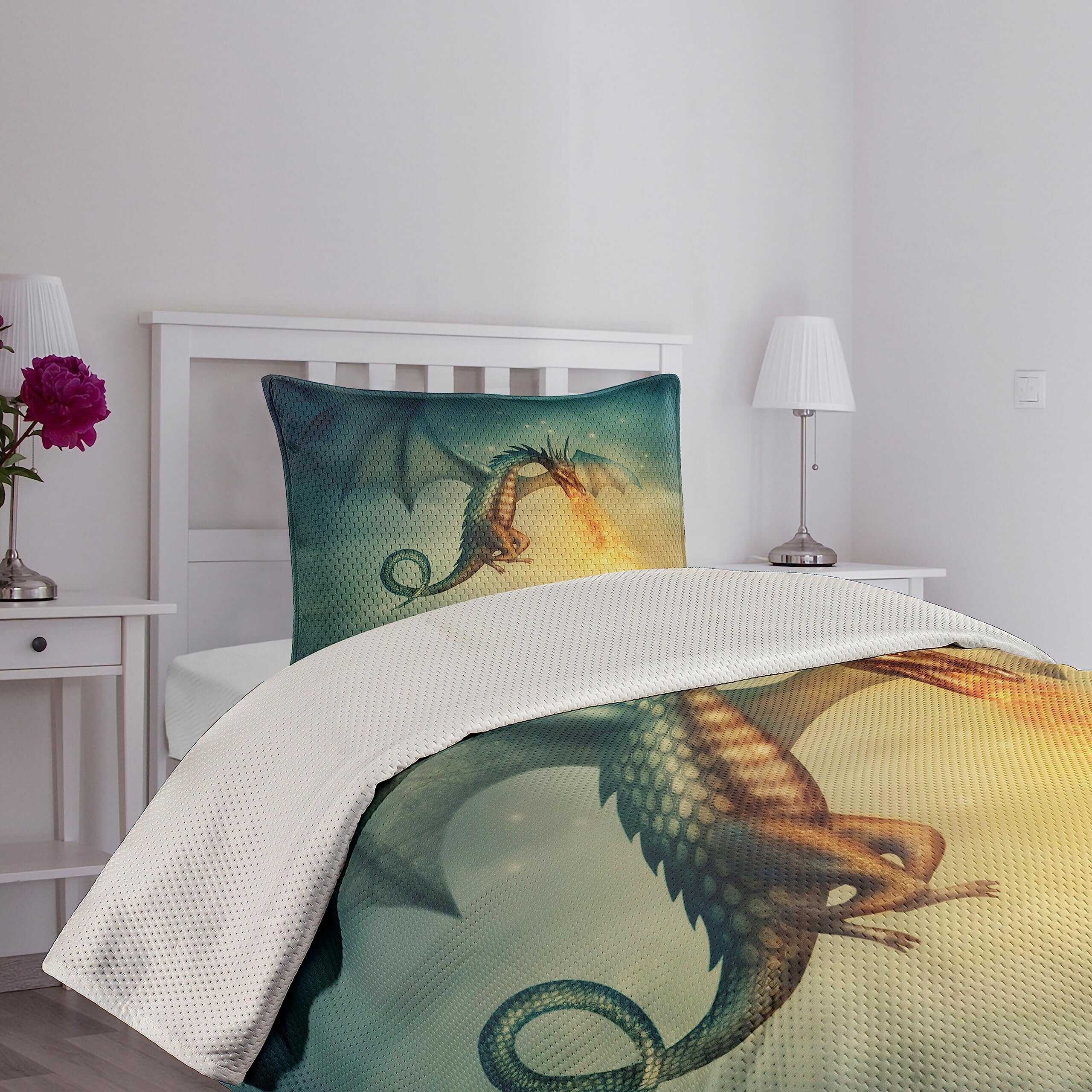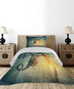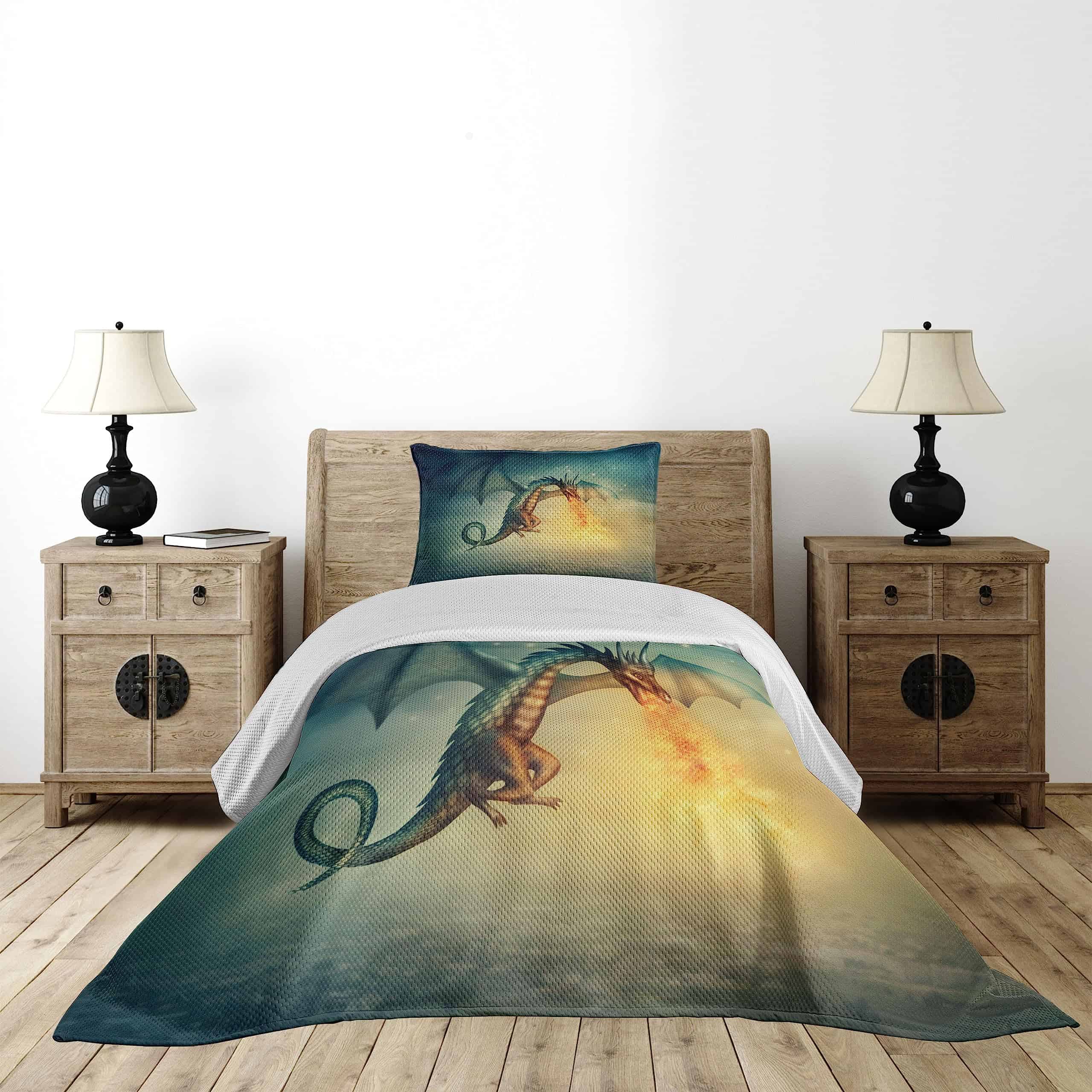 Cubrecama fantástico con diseño de dragón en el cielo, una increíble criatura imaginaria con un patrón cultural surrealista. El juego incluye 1 cubrecama y 1 funda de almohada. Hecho de poliéster suave de alta densidad de doble cepillado para una suavidad óptima y confort supremo. Resistente y pesado, no se caerá fácilmente de la cama. Puede ser usado como manta. Tecnología de tejido de alta calidad. Se puede lavar a máquina en ciclo frío, apto para secadora. Fácil planchado. No se desvanece. Excelente costura y mano de obra. Los estampados son de tecnología digital de última generación. El diseño se encuentra solo en el lado frontal de la colcha y las fundas de almohada.