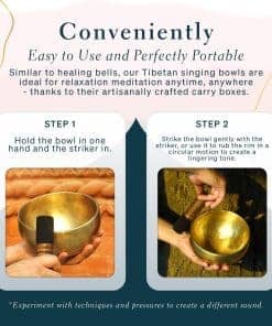 Nuestros Cuencos Tibetanos son fáciles de usar y portátiles, lo que significa que puedes llevar tu instrumento de sanación a donde sea que vayas. Con sus bolsas de transporte artesanales, puedes relajarte y meditar en cualquier momento y lugar.