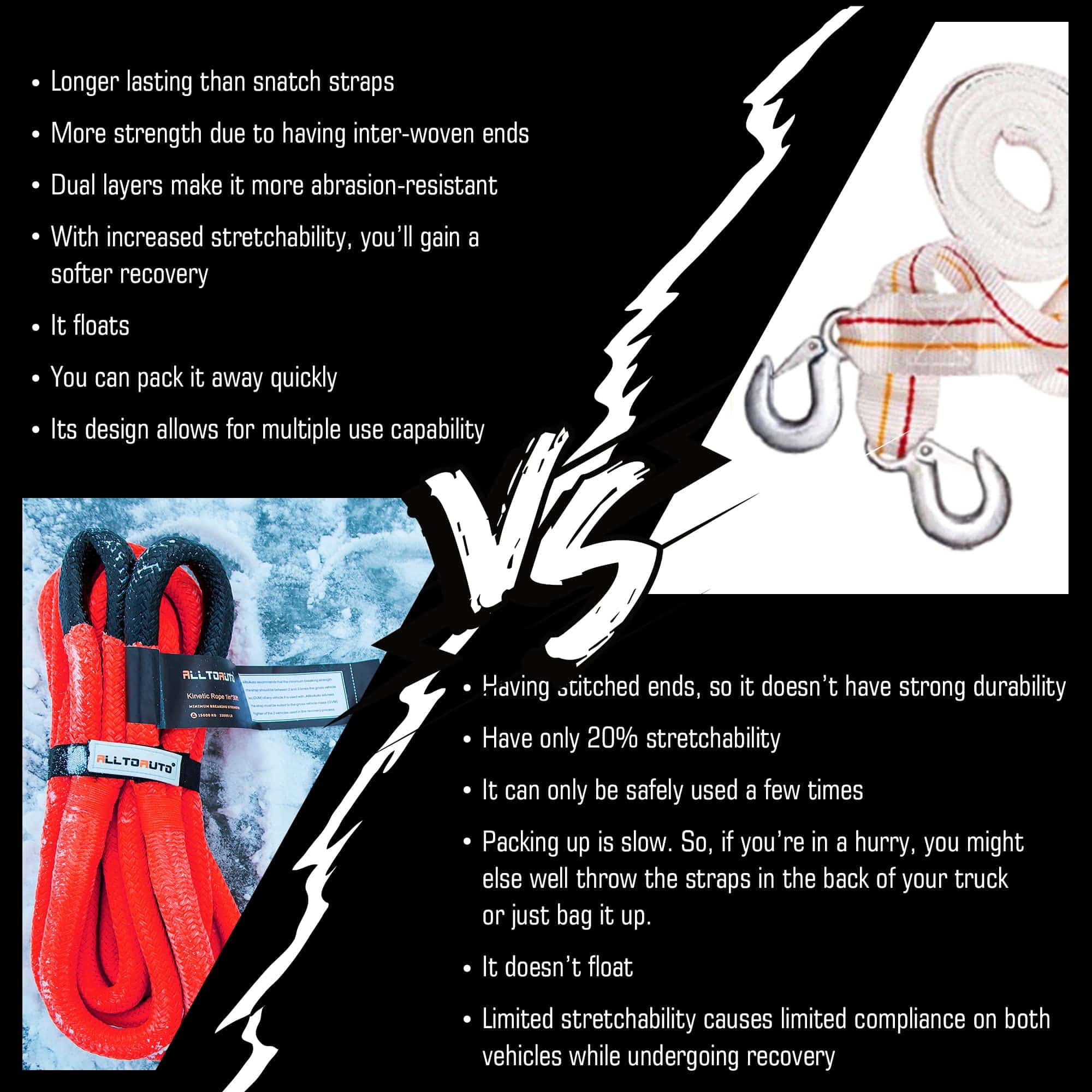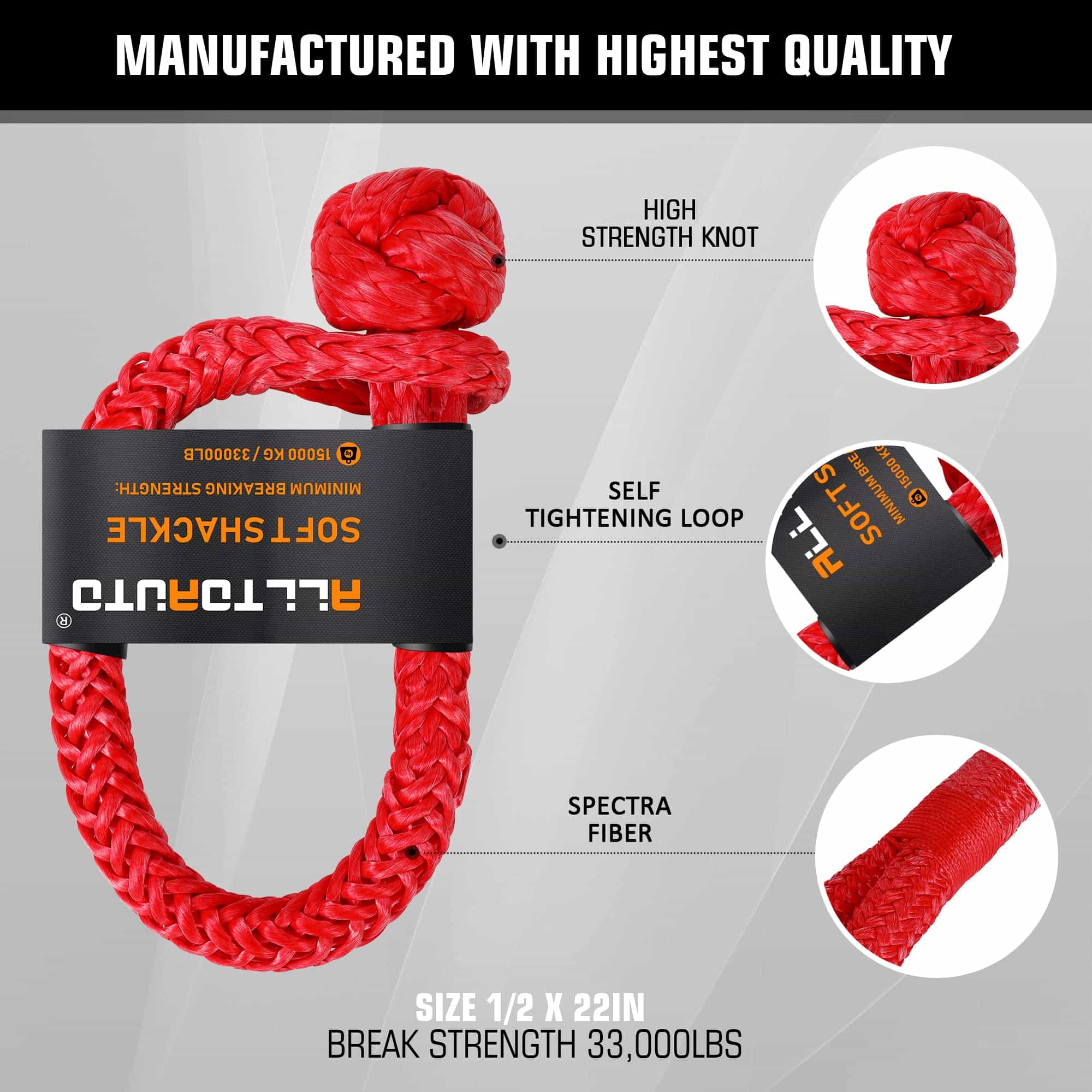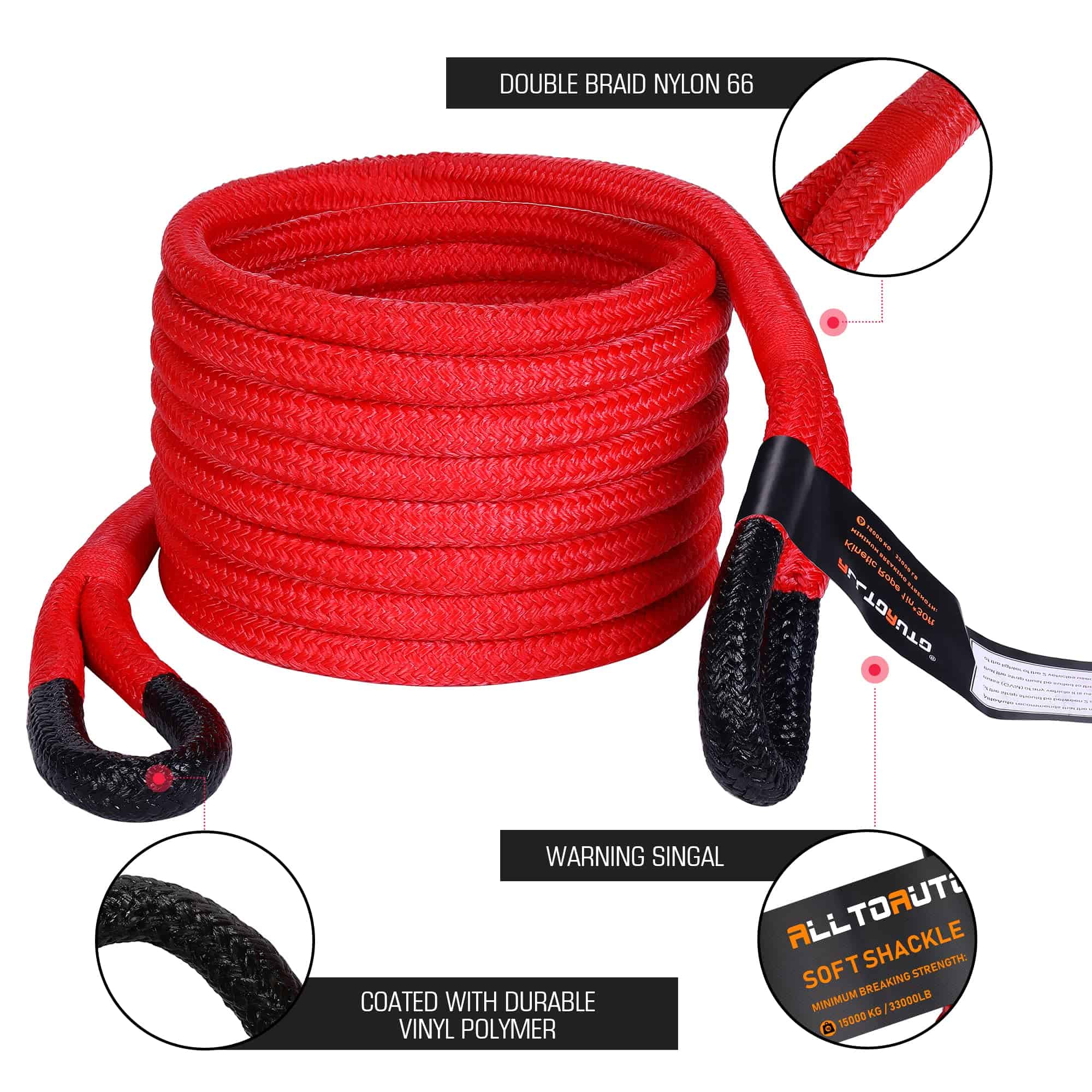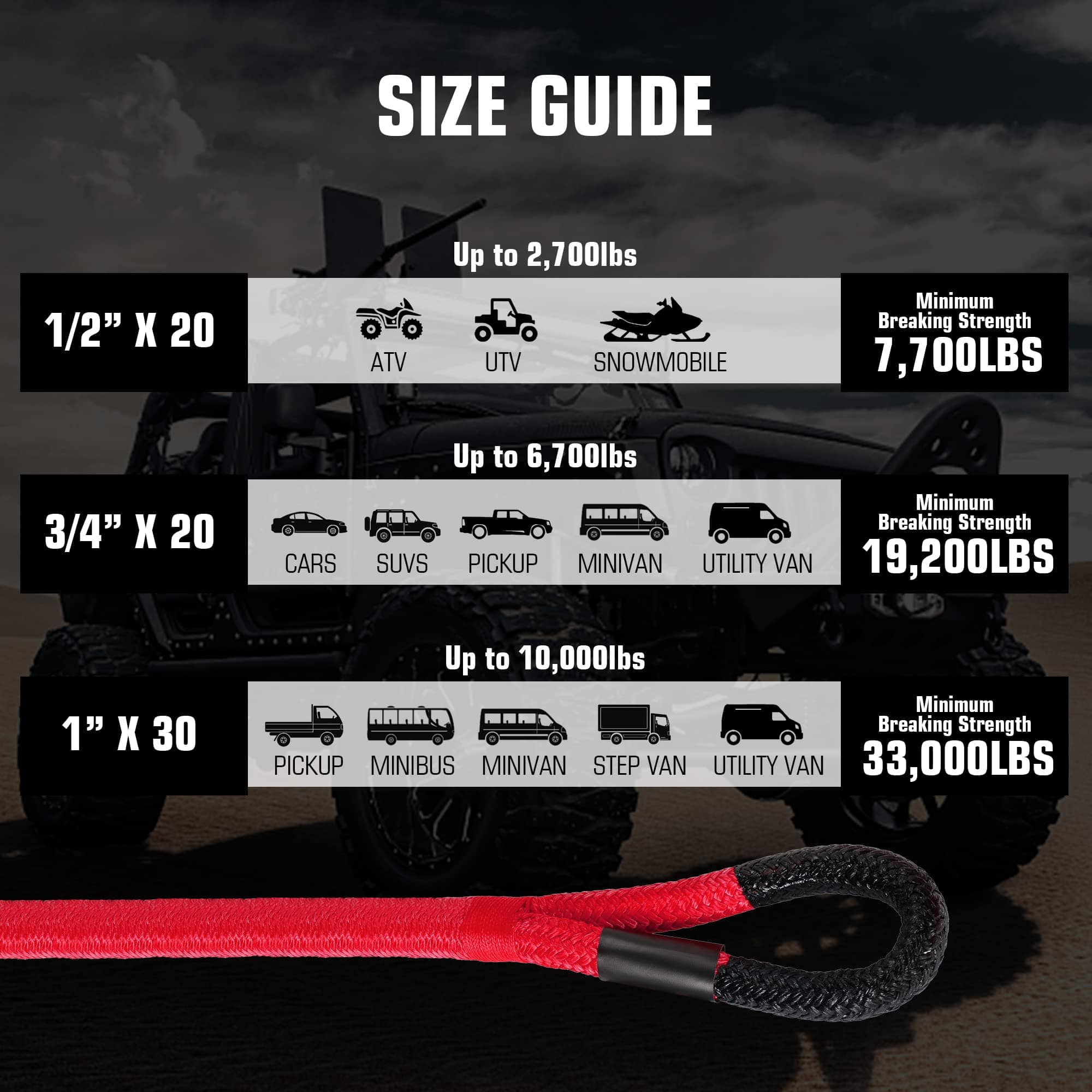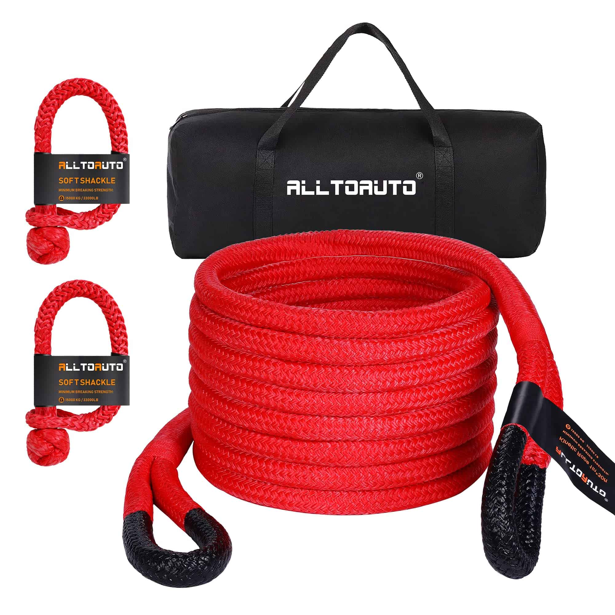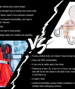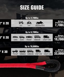 Con una resistencia máxima a la rotura de 33,000 libras, esta cuerda de remolque cinética puede manejar ATV, UTV, Tractores, Camiones y más. Viene con 2 soft shackles sintéticos que pueden agarrar fácilmente todos los puntos de remolque difíciles para sacar su vehículo con facilidad.