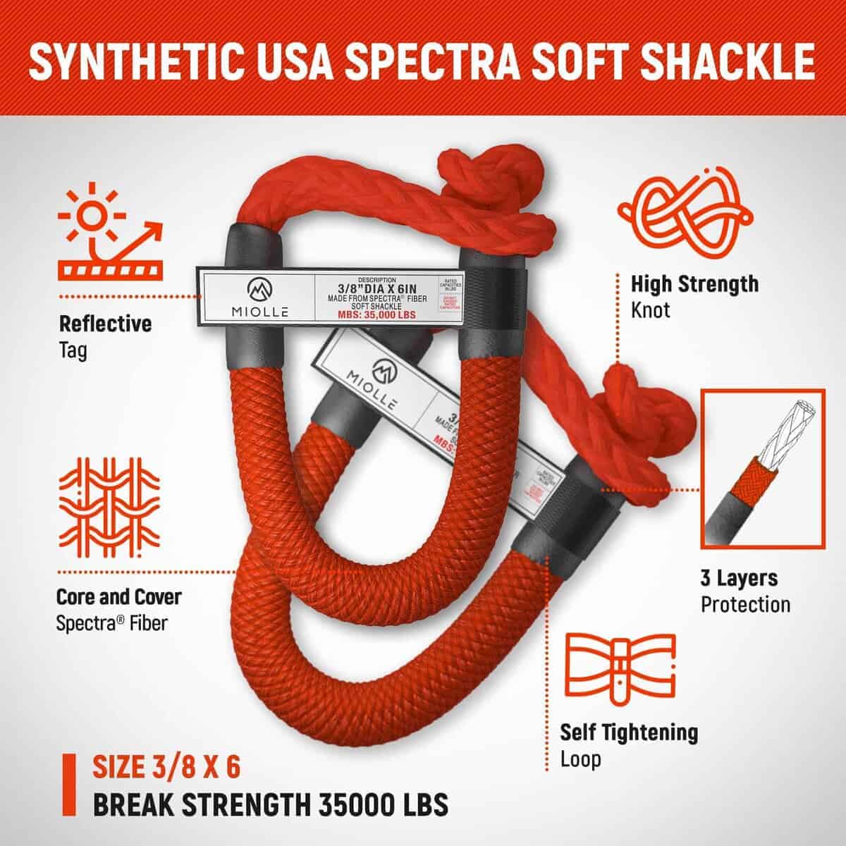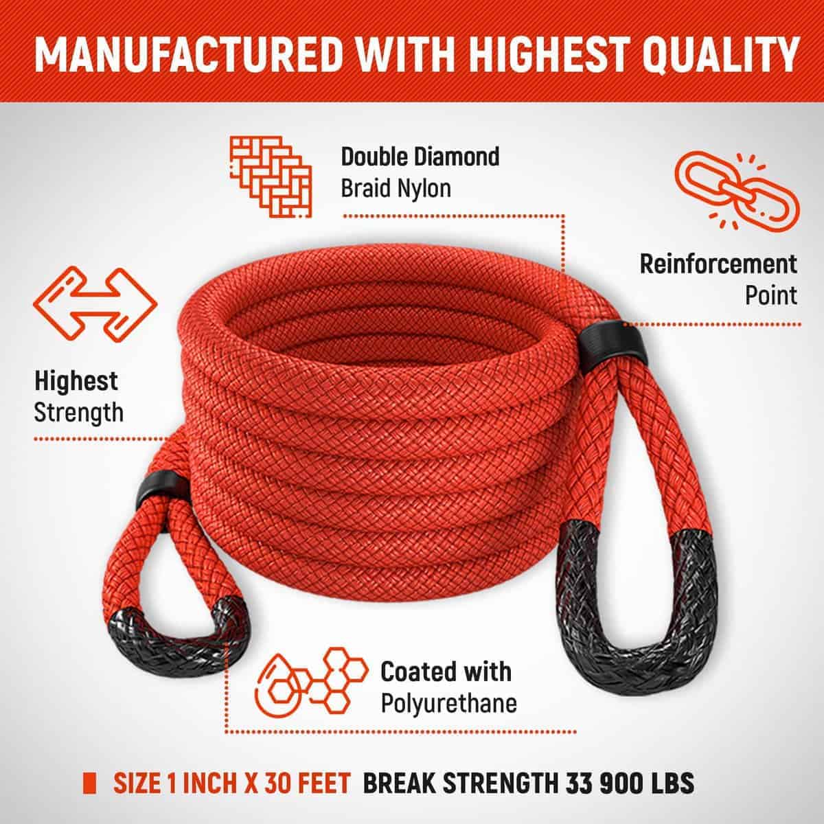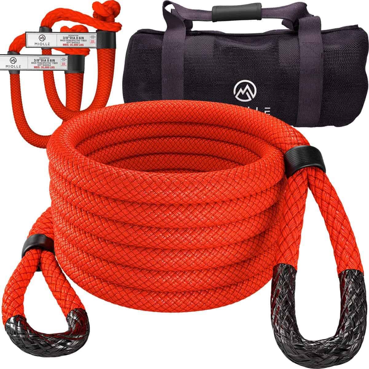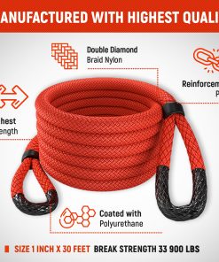 2. Nuestra Resistente Cuerda de Recuperación Cinética de Nylon 100% Doble Trenzado tiene una resistencia máxima de 33.900 lbs y una carga de trabajo segura de 11.300 lbs. Además, viene con un juego de 2 Manillar de Espectra con una resistencia máxima de 35.000 lbs y una carga de trabajo segura de 11.700 lbs.
