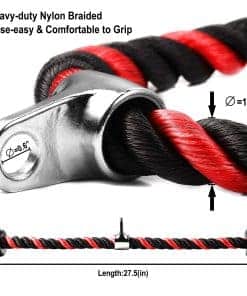 Cuerda de Tríceps Deluxe AWEFRANK para Cable de Bajada, ¡lleva tus entrenamientos al siguiente nivel! Esta cuerda de tríceps duradera y resistente está hecha de nylon trenzado rojo y negro recubierto, lo que garantiza una larga vida útil. Con una longitud de 27 pulgadas, esta cuerda de gimnasio te ayudará a maximizar tus extensiones de tríceps con cada repetición. Viene con un clip de accesorio de cable para mayor comodidad en el gimnasio. Los mangos de goma sólida evitan que tu mano se resbale durante el ejercicio, proporcionándote un agarre firme y seguro.