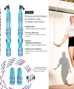 El formato rápido de la comba incluye mangos de aluminio que pesan 76 gramos, cables de 2.5 mm de grosor que pesan 63 gramos, un Sistema de Doble Rodamiento para una rotación más suave y un Sistema de Liberación Rápida para un fácil reemplazo del cable. Además, el pack de pesas que viene incluido cuenta con 3 pesas de diferentes tamaños y un cable para ajustar el nivel de resistencia a tu preferencia. Los cables de crossover también te permiten realizar trucos y crossovers de cuerda de forma más efectiva gracias a su diseño especial.