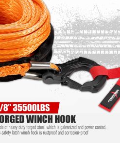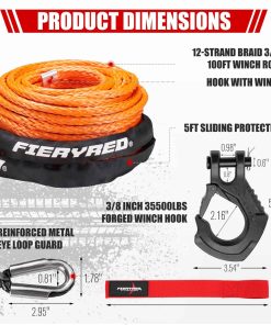 Cable de Winch Sintético FIERYRED 3/8 pulgadas 100FT con una resistencia de 26500lbs, trenzado por 12 hilos de fibra sintética de Ultra Alto Peso Molecular de Polietileno (UHMWPE), recubierto con capa de poliéster. Incluye Gancho de Winch Forjado de 33500lbs, funda protectora deslizante de 5 pies, y es una actualización perfecta para winches de 9,000 lbs a 13000 lbs. Más resistente y seguro que los cables de acero tradicionales, más ligero y apto para la mayoría de los winches como SUV, Jeep, camioneta, ATV, UTV, etc. Compatible con anclaje de 26500lbs.