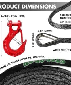 Upgrade 3/8 «winch rope kit:STEGODON winch lines are braided by 12 strands of UHMWPE and coated with Premium Urethane, which has high wear resistance and UV resistance. 3/8 inch winch rope provides 23809LBS breaking strength which is engineered for a variety of winches ranging from 9,000 lbs to 14,500 lbs.