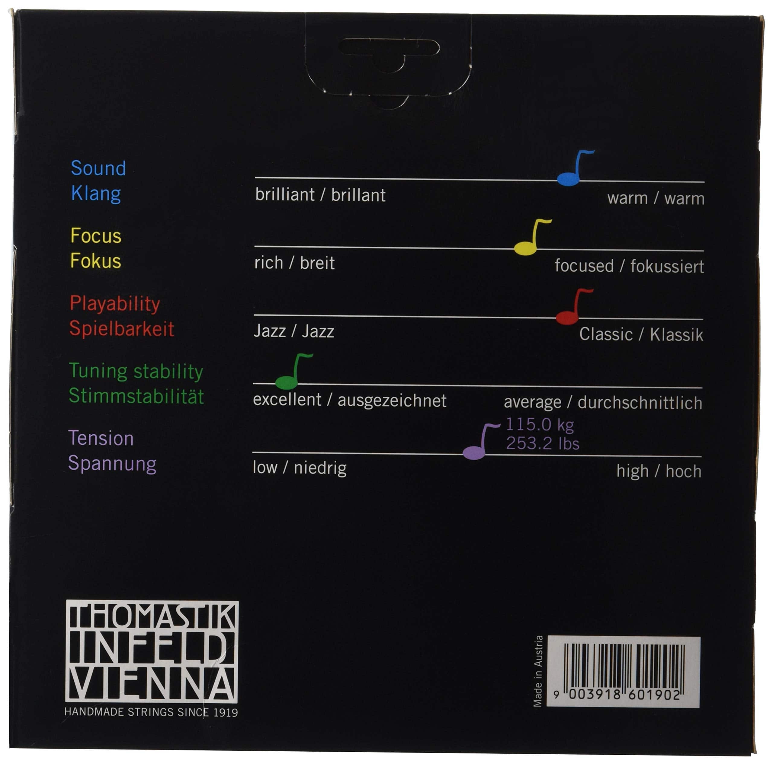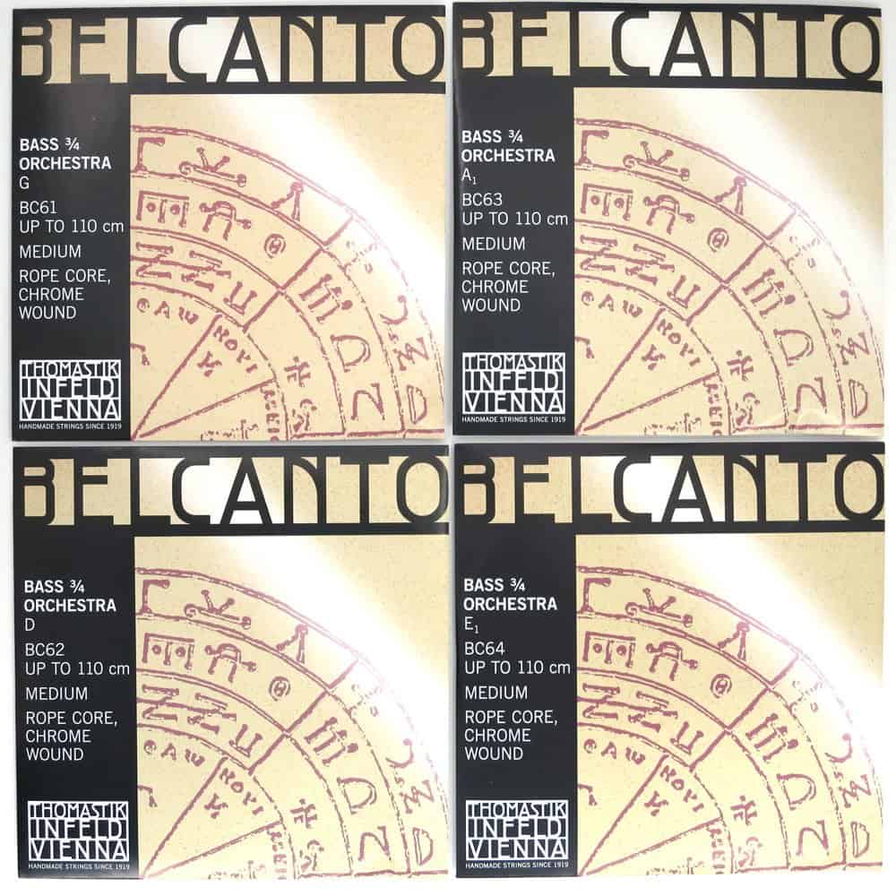 Conjunto de contrabajo Thomastik-Infeld Belcanto con su especial núcleo de cuerda de acero retorcido se instala rápidamente y entona extremadamente bien. El tono es oscuro y cálido con una excelente resonancia y una amplia gama de colores tonales. Ofrece una gran proyección con un esfuerzo moderado. Conjunto de contrabajo, tamaño 3/4.