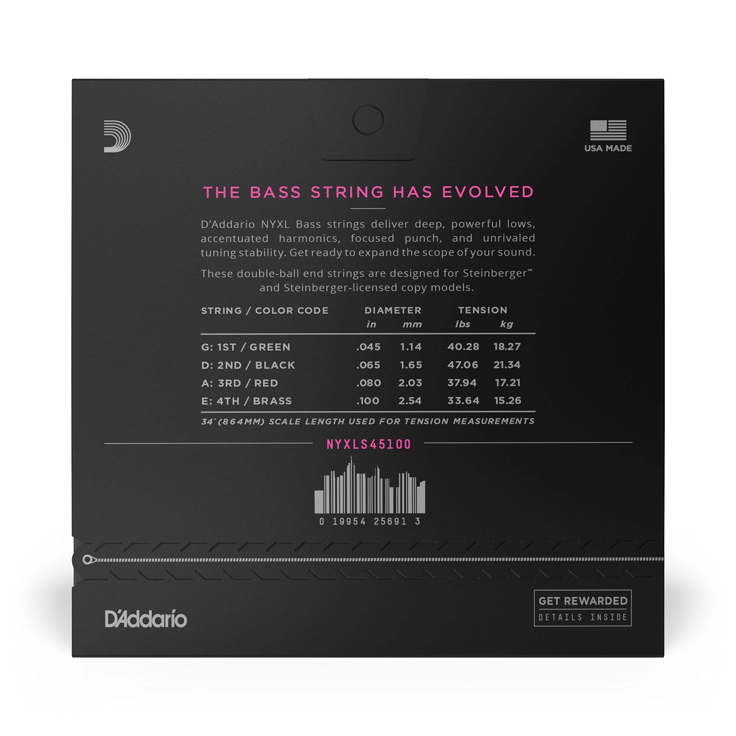 Las cuerdas de bajo NYXL golpean más fuerte, se doblan más lejos y suenan más gruesas que cualquier otra cuerda de bajo que hayas tocado antes. Como nuestras cuerdas de bajo premium sin recubrimiento, las cuerdas de bajo NYXL ofrecen una resistencia a la rotura más alta, una estabilidad de afinación mejorada y armónicos acentuados donde más importa. Utilizando un núcleo de acero NY y tecnología Fusion Twist, junto con alambre de envoltura de acero niquelado premium, con una proporción núcleo-envoltura reingenierada, las cuerdas de bajo NYXL ofrecen una versatilidad adicional, una sensación familiar y un tono potenciado que ampliarán el alcance de tu registro bajo. Este set 40-100 Regular Light Double Ball End tiene una tensión uniforme agradable, un tono brillante y un extremo bajo ajustado, y está hecho con extremos de bola en ambos extremos de las cuerdas para adaptarse a bajos Steinberger y otros bajos con diseños similares.