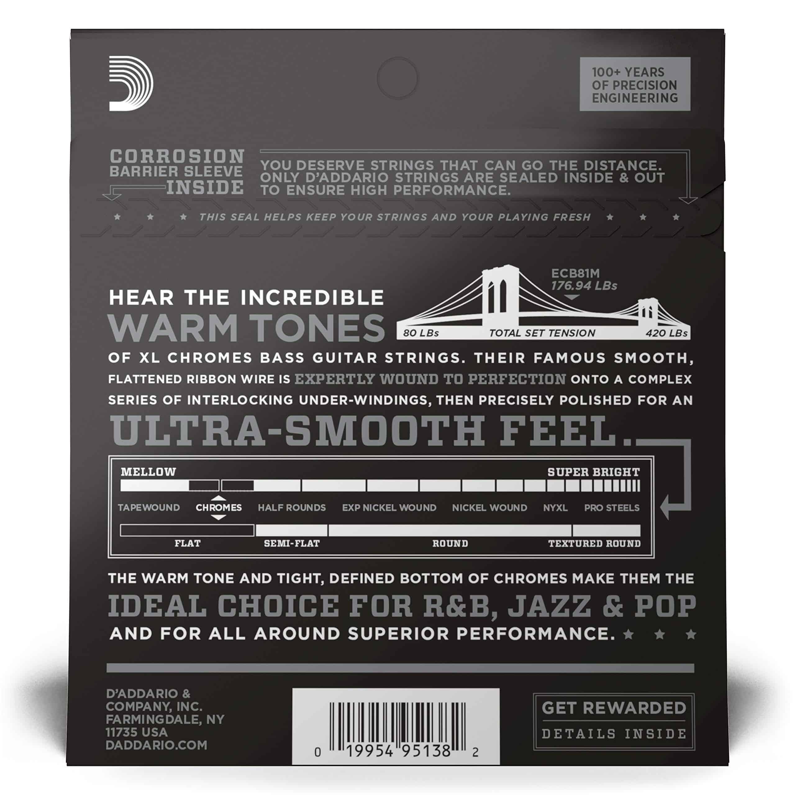 ECB81M, una versión de escala mediana de las cuerdas de bajo Flatwound más vendidas de D’Addario, son conocidas por su tono cálido, suave y su sensación pulida. Chromes ofrecen un extremo inferior profundo y rico que las convierte en la opción de cuerdas con herida plana para músicos de Jazz, R&B y Pop. Se ajusta a bajos de escala mediana con una longitud de escala de cuerda de hasta 34 pulgadas.
