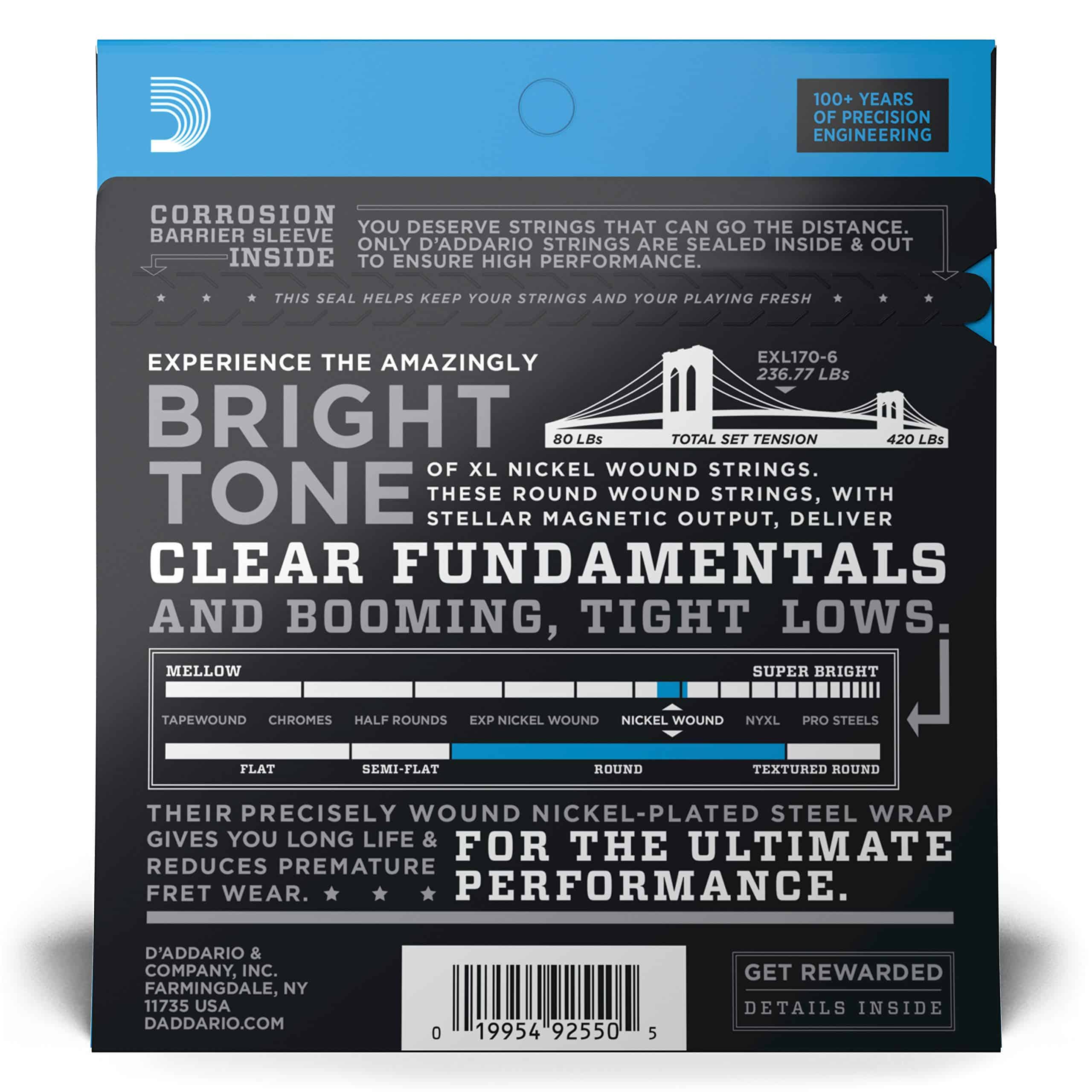 XL Nickel son el estándar de la industria en cuerdas para bajo eléctrico. Con sus fundamentos claros, sólidos bajos apretados y la construcción confiable de D�Addario, son confiadas por los músicos de todo el mundo para manejar cualquier actuación. Las cuerdas de bajo XL Nickel están hechas con un núcleo de acero de alto carbono y enrolladas con alambre envuelto de acero niquelado, para un tono consistentemente brillante y una tocabilidad suave, ideal para una amplia variedad de estilos de bajo. EXL170-6 es una versión de 6 cuerdas del juego de bajo más vendido de D�Addario. Con la adición de las cuerdas graves .130 y agudas .32, este juego ofrece la combinación ideal de tono brillante y resonante distinto y una sensación cómoda. El juego más versátil y universalmente atractivo para todos los estilos de juego. Se adapta a bajos de escala larga con una longitud de escala de cuerda de hasta 36 1/4 pulgadas.