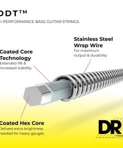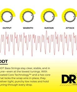 Las Cuerdas de Bajo DDT Drop Down Tuning entran en afinación de inmediato y se bloquean gracias a la Tecnología de Núcleo Preciso (ACT), un alambre de núcleo hexagonal recubierto que fija el alambre de envoltura de acero inoxidable en su lugar para aumentar la estabilidad y mantener la entonación bajo cualquier tensión. Ahora puedes tocar notas en tonos más bajos que son limpias, claras y en afinación. Cambia las afinaciones y las DDT se bloquean de inmediato y requieren muy poco o ningún ajuste entre las interpretaciones.