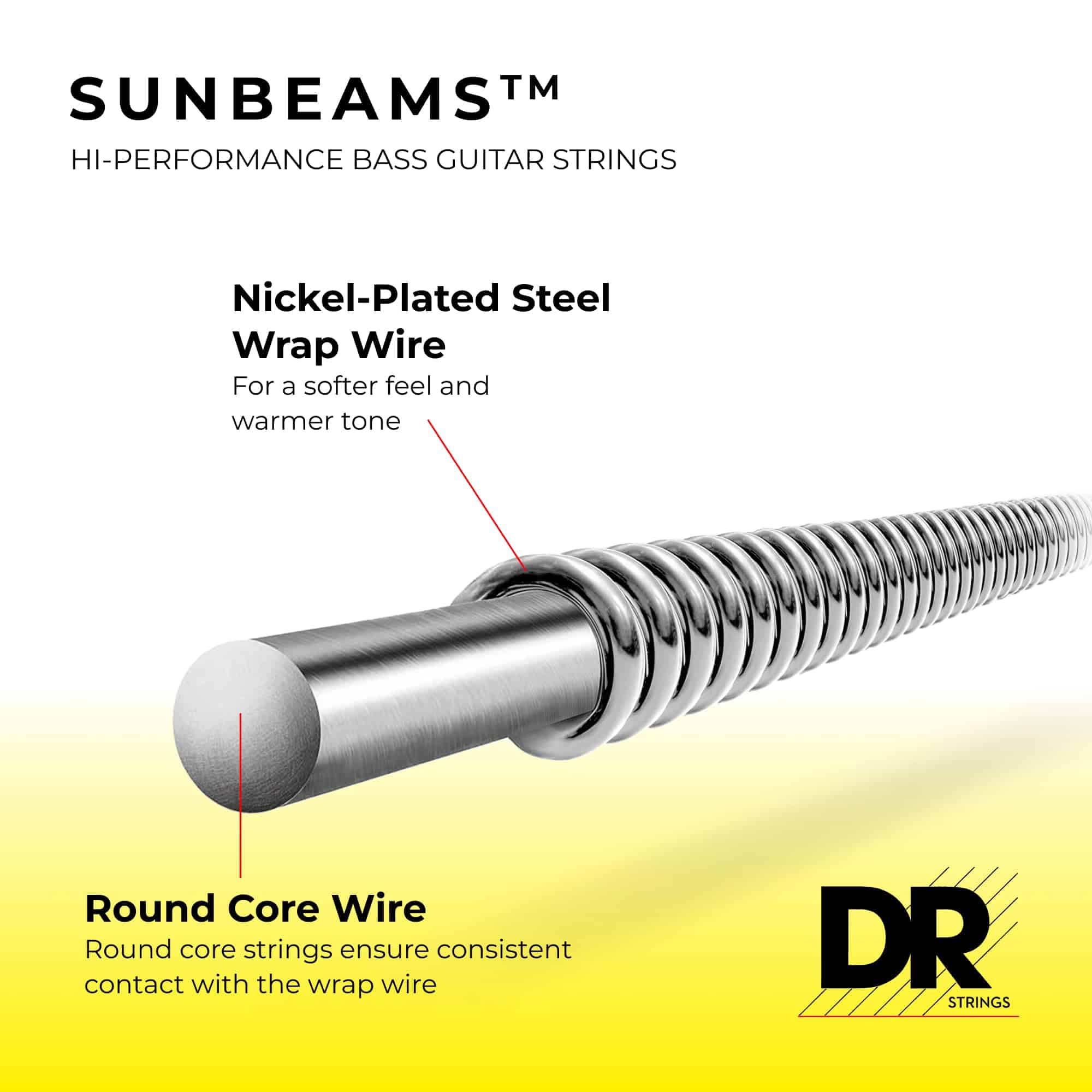 SUNBEAMS son otro paso adelante en un camino continuo para los músicos que constantemente buscan mejorar sus habilidades y herramientas para lograr satisfacción musical. SUNBEAMS son la próxima generación de cuerdas de bajo niqueladas, ya que están enrolladas en núcleos redondos. Sunbeams son un avance para el músico tradicional y el avanzado exponente del músico de bajo sin trastes, ambos de los cuales buscan brillo y calidez. Sunbeams cuentan con la reconocible sensación y flexibilidad de la construcción de núcleo redondo de DR, con calidez de níquel, suavidad al tacto y mayor respuesta a las pastillas magnéticas debido al contenido magnético sensible (en comparación con el acero inoxidable) del alambre envuelto de níquel.