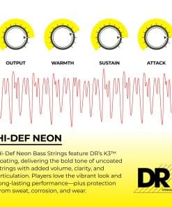 Cuerdas de bajo NEON amarillo para guitarra baja con tecnología K3. El recubrimiento K3 es el primer recubrimiento del que los músicos informan, «suena igual o mejor que las cuerdas sin recubrimiento.» El asombroso y exclusivo recubrimiento tecnológico K3 de DR es el primer recubrimiento que no se disculpa ni hace excusas por no ofrecer un sonido igual al de las cuerdas sin recubrimiento. Los músicos nos dicen que estas cuerdas tienen más volumen, menos armónicos no deseados, mayor claridad y articulación que las cuerdas estándar sin recubrimiento. Sin embargo, brindan la misma protección contra la corrosión y la transpiración, así como una mayor vida útil del tono por la que se conocen las cuerdas recubiertas.