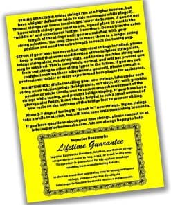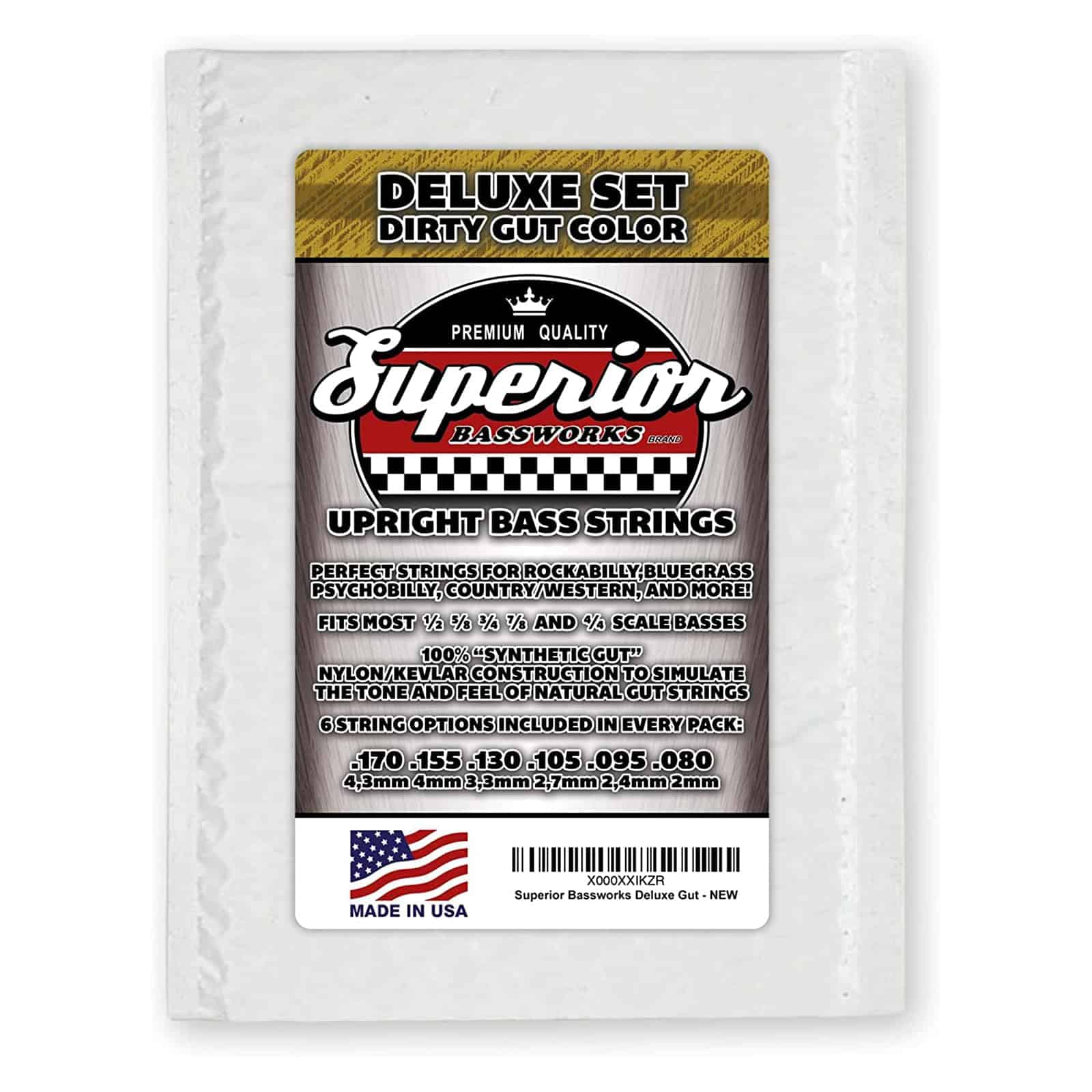 Textura de tripa simulada en toda la longitud de las cuerdas. Las cuerdas tienen una textura ligeramente suave a media que ha sido «cortada en espiral» en la cuerda. Esta ligera textura facilita un mejor agarre de las cuerdas para tocar pizicato a gran velocidad y arrastrar trillizos con casi ningún esfuerzo. Las cuerdas «atraen» el aire y lo obligan a moverse, produciendo más tono de medios y graves al tocar acústicamente. Todos nuestros juegos de cuerdas de nylon vienen como un surtido de 6 cuerdas (6 cuerdas en total de varios calibres. Ver fotos) para contrabajo de tamaño 1/2, 3/4 y 4/4. La idea es que algunos músicos prefieren cuerdas más finas y de menor tensión mientras que otros prefieren cuerdas más gruesas y de mayor tensión. ¡Por qué no ofrecer una amplia gama de espesores y tensiones en un solo paquete de cuerdas! ¡Esto es exactamente lo que hacemos! Nuestros juegos de cuerdas también incluyen extremos de metal con recubrimiento de goma. ¡SIN NUDOS que se desaten en medio de tu actuación! Nos enorgullece ser la única empresa que ofrece esta configuración. Necesitas cuerdas que suenen genial tanto en acústico como amplificado, cuerdas que no lastimen tus dedos si necesitas tocar 3 sets en una noche, cuerdas que se mantengan afinadas en climas calurosos/fríos/húmedos/secos. Necesitas cuerdas de nylon con núcleo de Kevlar de Superior Bassworks para contrabajo. Perfectas para Rockabilly, Psychobilly, Bluegrass, Country/Western, ¡y mucho más! Los tamaños de cuerda incluidos en cada paquete son: .170, .155, .130, .105, .095, .080 (tamaños en pulgadas). Si tu contrabajo nunca ha tenido cuerdas no metálicas instaladas, ten en cuenta que es posible que se requiera alguna modificación en las ranuras de las cuerdas del cordal, muescas de las cuerdas del puente, muescas de las cuerdas de la cejuela y agujeros de las clavijas. Esto es completamente normal y no te impedirá cambiar a otros tipos de cuerdas en el futuro. Por favor, mide tu contrabajo antes de hacer el pedido. Si no te sientes seguro haciendo estos ajustes por ti mismo, consulta a un lutier profesional o a un músico de contrabajo más experimentado para obtener ayuda. Estas cuerdas no se recomiendan para estudiantes de orquesta escolar.