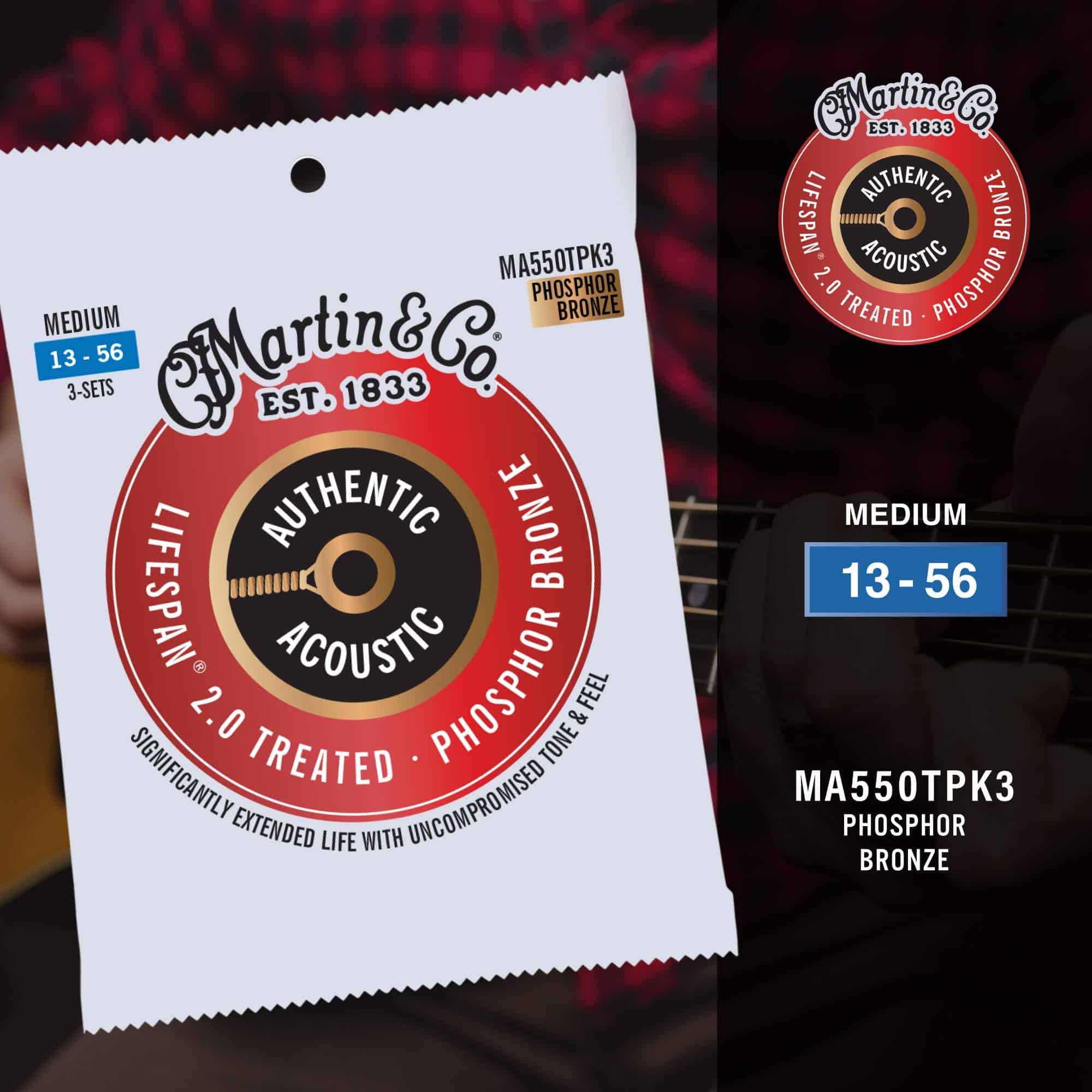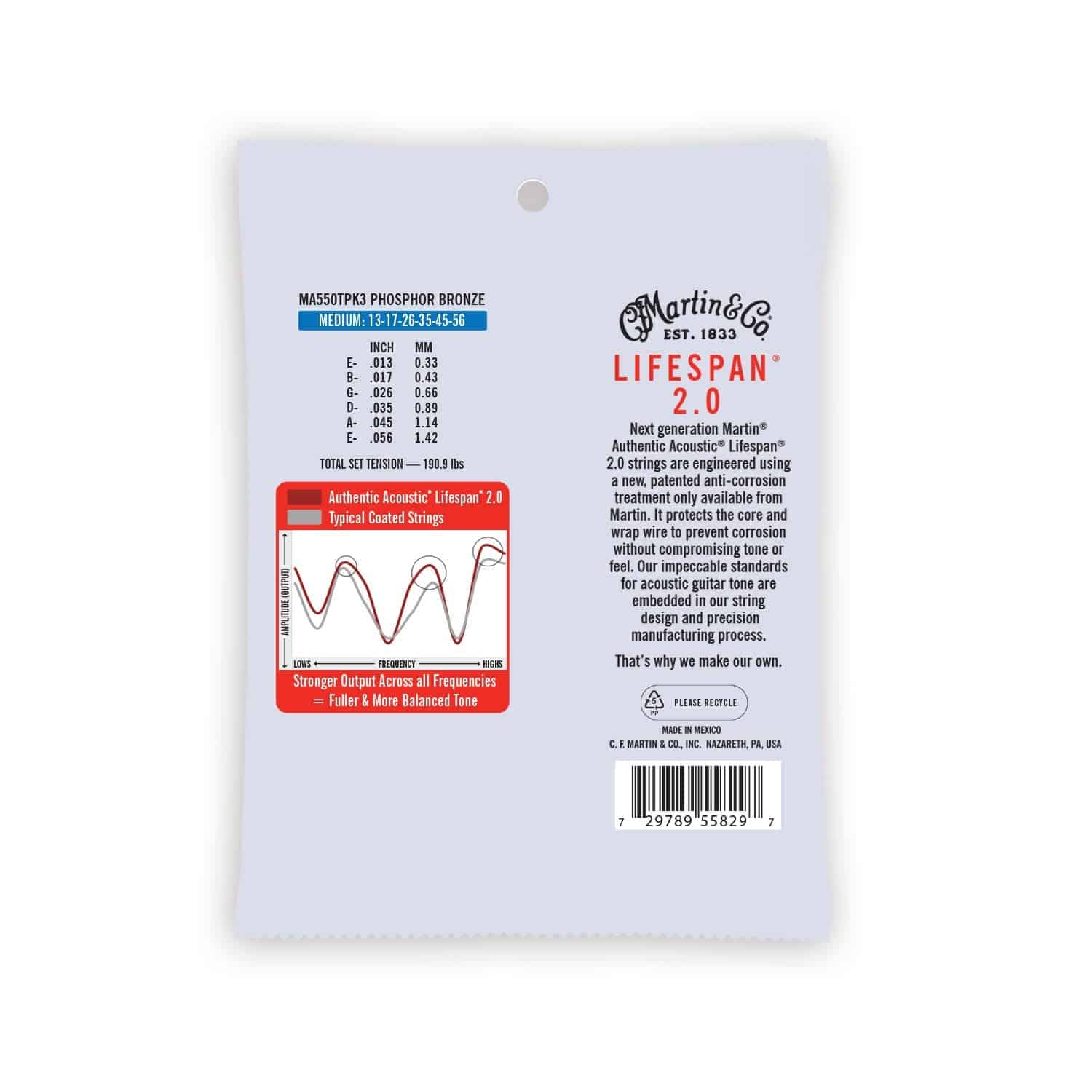 Las Cuerdas de Guitarra Auténticas Martin Lifespan 2.0 proporcionan calidad, artesanía y tono inigualables para tu guitarra acústica. Diseñadas para producir un tono verdadero y consistente, estas cuerdas de calibre medium ofrecen una excelente estabilidad de afinación y facilidad de interpretación para que tu guitarra pueda resistir a horarios rigurosos de práctica y presentaciones. Hechas de bronce fosforado 92/8, estas cuerdas cuentan con un tratamiento anticorrosión patentado que protege el núcleo y el alambre de envoltura contra la corrosión. Este paquete de cuerdas de guitarra de grado profesional durará a través de largas sesiones de jam, canciones alrededor de la fogata en la noche y mucha interpretación. Es un juego de cuerdas ultra-confiable que puedes llevar de gira o mantener en el estudio. Diseñadas para resaltar el tono real de tu guitarra, estas cuerdas de guitarra de bronce fosforado 92/8 pueden ser utilizadas para blues fingerstyle, Americana, country, bluegrass, ragtime y muchos estilos más. Con este juego, recibirás 3 paquetes de 6 cuerdas de guitarra diseñadas para un rendimiento de interpretación óptimo. La cuerda de baja E mide 0.056″, la cuerda A mide 0.045″, la cuerda D mide 0.035″, la cuerda G mide 0.026″, la cuerda B mide 0.017″ y la cuerda alta E mide 0.013″. Este juego total de cuerdas cuenta con una tensión de 190.9, lo que facilita obtener un tono rico y brillante con una sensación más suave. ¡Añade estas cuerdas de guitarra profesionales a tu equipo de gira y interpretación hoy! Martin Guitar ha estado produciendo guitarras y accesorios de alta calidad elegidos por los músicos desde 1833. Las Cuerdas de Guitarra Acústica Auténticas Martin Lifespan 2.0 son el verdadero negocio, no una imitación. Descubre la verdadera voz de tu guitarra con este paquete de cuerdas de guitarra de grado profesional