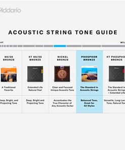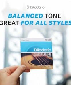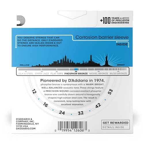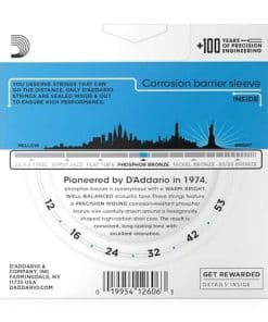 D’Addario fue el primero en utilizar Bronce Fosforado en cuerdas de guitarra acústica en 1974. Hoy en día, el Bronce Fosforado se toca en todo el mundo y se considera el estándar en cuerdas acústicas, gracias a su hermoso equilibrio sonoro y calidez tonal. Nuestras innovadoras cuerdas de guitarra acústica de Bronce Fosforado están enrolladas con precisión con alambre de envoltura de bronce fosforado sobre un núcleo de acero al carbono, proporcionando versatilidad tonal adecuada para todos los estilos acústicos y géneros musicales. Las cuerdas de calibre ligero 12-53 son nuestro calibre acústico más popular, ofreciendo un buen equilibrio entre jugabilidad y tono.
