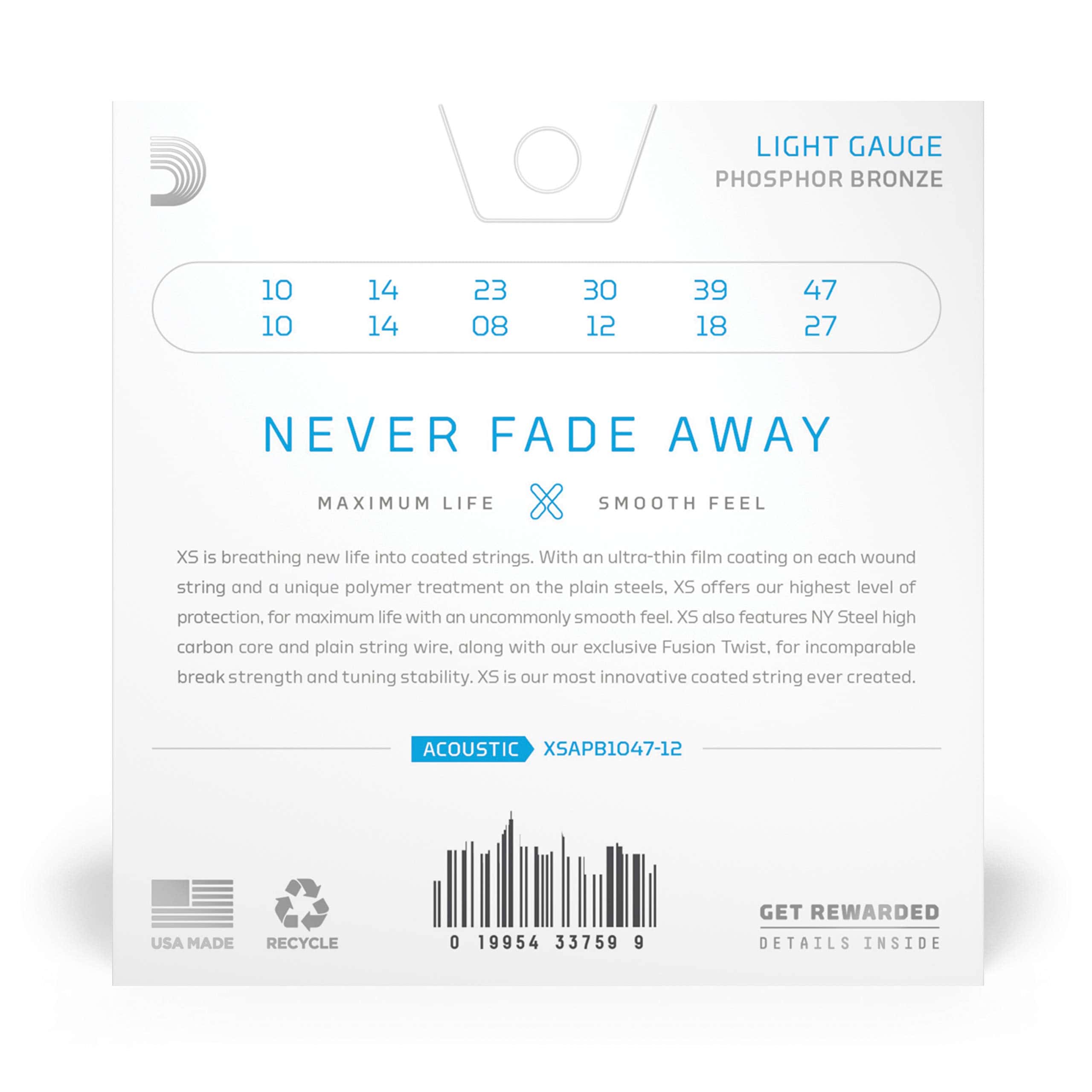 Nacidas de nuestro mayor avance en innovación de cuerdas, las cuerdas XS Phosphor Bronze tienen la vida útil más larga de cualquier cuerda de guitarra acústica de D’Addario. El recubrimiento XS dota a nuestras cálidas y equilibradas cuerdas de bronce fosforado de máxima vida útil, con un tacto inusualmente suave. Hechas con un núcleo de acero NY, alambre de envoltura de bronce fosforado y tecnología Fusion Twist, las cuerdas acústicas de guitarra XS recubiertas tienen una resistencia a la rotura incomparable y una estabilidad de afinación, además de una vida útil dramáticamente aumentada. Este juego de calibre 10-47 Light 12-string es ideal para guitarras acústicas de 12 cuerdas.