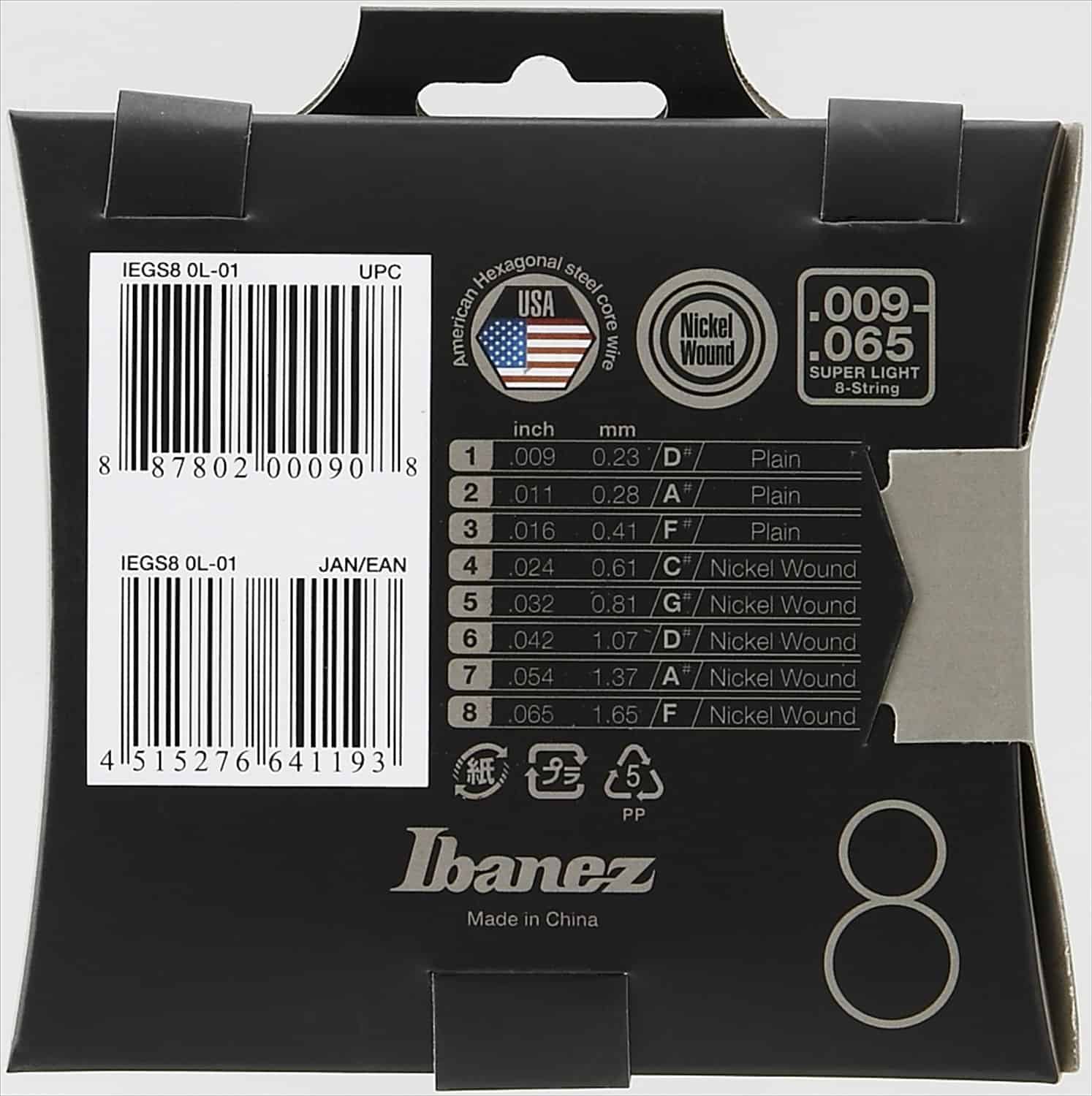Las Ibanez IEGS8 están diseñadas para adaptarse a cualquier guitarra eléctrica de 8 cuerdas ya sea fabricada por Ibanez o no. Las Ibanez IEGS8 cuentan con un calibre de cuerda de 009, 011, 016, 024, 032, 042, 054, 065. Las cuerdas IEGS8 también están enrolladas en níquel