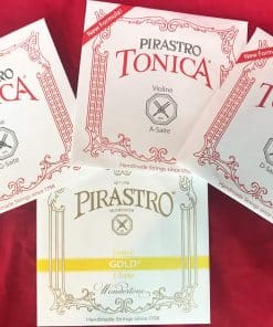 Para Violín 4/4, Juego Completo de Cuerdas Calibre Medio, Hecho en Alemania, Cuerda E (marca Pirastro gold label e: acero plateado – Extremo de Bola, Cuerda A: Enrollado de Aluminio – Núcleo Sintético – Extremo de Bola, Cuerda D: Enrollado de Plata – Núcleo Sintético – Extremo de Bola, Cuerda G: Enrollado de Plata – Núcleo Sintético – Extremo de Bola