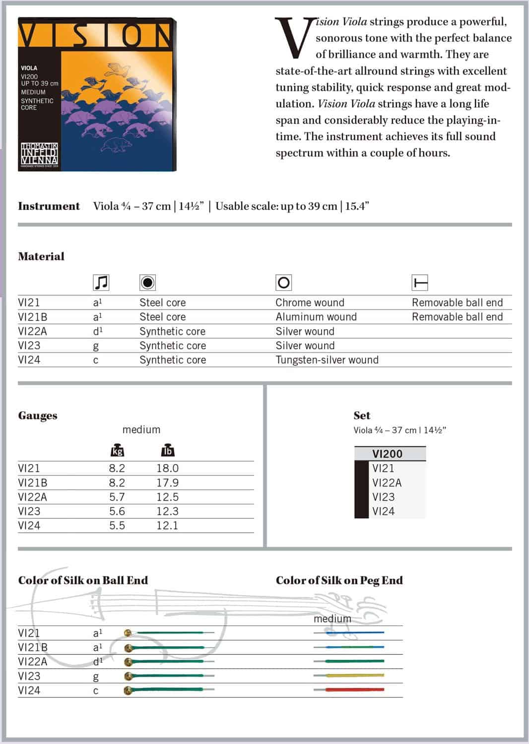 Las cuerdas Thomastik-Infeld Vision, enrolladas en un núcleo sintético avanzado, están diseñadas para asentarse rápidamente y lograr una afinación estable en muy poco tiempo. Impresionan con un tono enfocado, claro, abierto y brillante; el ajuste perfecto para el sonido moderno de hoy. Las cuerdas Vision pueden ser mezcladas con casi cualquier cuerda de núcleo sintético. Set de Viola para tamaño 4/4.