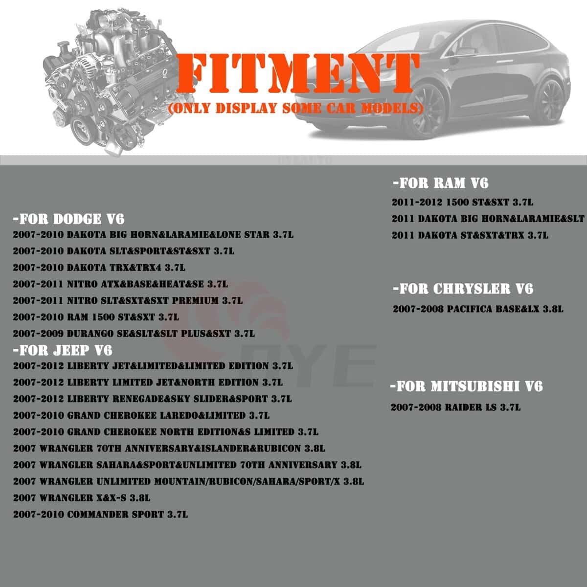 Compatibilidad (Solo muestra algunos modelos de automóviles): – Para Dodge V6 2007-2010 Dakota&Ram 1500 3.7L 2007-2011 Nitro 3.7L 2007-2009 Durango 3.7L – Para Jeep V6 2007-2012 Liberty 3.7L 2007-2010 Grand Cherokee&Commander 3.7L 2007 Wrangler 3.8L – Para Ram V6 2011-2012 1500 3.7L 2011 Dakota 3.7L – Para Chrysler V6 2007-2008 Pacifica 3.8L – Para Mitsubishi V6 2007-2008 Raider 3.7L
