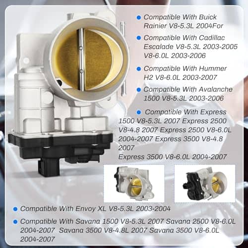 ¿Por qué elegir nuestro cuerpo del acelerador electrónico? Excelente Desempeño: El acelerador electrónico utiliza un sistema avanzado de control electrónico que proporciona un tiempo de respuesta más rápido. Esto mejora la aceleración del vehículo. Fiabilidad y Durabilidad: Nuestro acelerador electrónico está hecho de materiales de alta calidad que son resistentes a la corrosión y alta temperatura. Mejora considerablemente la confiabilidad del producto. Nuestro acelerador electrónico pasará por una serie de pruebas de durabilidad antes de salir de fábrica, incluyendo pruebas de alta temperatura, baja temperatura, alta humedad, vibración y otras pruebas de simulación ambiental, para garantizar que el producto tenga una excelente durabilidad. Ahorro de Energía y Protección Ambiental: Al controlar precisamente la apertura del acelerador, el combustible se quema de manera más completa, reduciendo así el consumo de combustible y las emisiones de escape. Se mejora aún más la economía de combustible y el rendimiento ambiental del motor. ¿Qué autos pueden usar nuestro cuerpo del acelerador electrónico? Compatible con Chevrolet: Silverado 1500 V8 4.8L 2003 – V8 5.3L 2003 – V8 5.3L ELECTRIC/GAS 2004 – V8 6.0L 2003 Silverado 1500 CLASSIC – V8 4.8L 2007 – V8 5.3L 2007 – V8 5.3L ELECTRIC/GAS 2007 – V8 6.0L 2007 Silverado 2500 V8 5.3L 2003 – V8 6.0L 2003 Silverado 2500 CLASSIC 6.0L V8 2007 Silverado 3500 V8 6.0L 2003 Silverado 3500 CLASSIC V8 6.0L 2007 Express 1500 V8 5.3L 2007 Express 2500 V8 4.8L 2007 – V8 6.0L 2004 Express 3500 V8 4.8L 2007 – V8 6.0L 2004 Suburban 1500 V8 5.3L 2003 – V8 6.0L 2006 Suburban 2500 V8 6.0L 2003 Compatible con Buick: Rainier V8 5.3L 2004 Compatible con Cadillac: Escalade 2003-2006 (EXT ESV) Compatible con Isuzu: Ascender V8 5.3L 2003-2004 Compatible con GMC: Envoy XL V8 5.3L 2003-2004 XUV 2004 Savana 1500 Van V8 5.3L 2007 Savana 2500 Van V8 4.8L 2007 Savana 2500 Van V8 6.0L 2007 Savana 2500 3500 Van V8 6.0L RPO Code KUP (Electronic Variable Speed) 2004-2006 Savana 3500 Van V8 4.8L 6.0L 2007 Sierra 1500 V8 4.8L 2003 – V8 5.3L 2003 – V8 5.3L ELECTRIC/GAS 2005 – V8 6.0L 2003 Sierra 1500 CLASSIC V8 4.8L 2007 – V8 5.3L 2007 – V8 5.3L ELECTRIC/GAS 2007 – V8 6.0L 2007 Sierra 2500 V8 6.0L 2003 – CLASSIC V8 6.0L 2007 Sierra 3500 V8 6.0L 2003 – CLASSIC V8 6.0L 2007 Yukon V8 4.8L 2003 – V8 5.3L 2003 – V8 6.0L 2003 Yukon XL 1500 V8 5.3L 2003 – V8 6.0L 2003 Yukon XL 2500 V8 6.0L 2003-2006