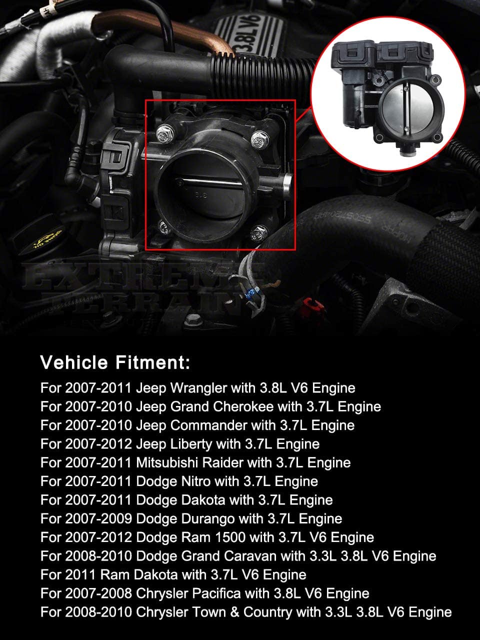3. Este Cuerpo del Acelerador es Compatible con los siguientes vehículos: 2007-2011 Jeep Wrangler 3.8L V6 Motor, 2007-2010 Jeep Grand Cherokee 3.7L, 2007-2010 Jeep Commander 3.7L, 2007-2012 Jeep Liberty 3.7L, 2007-2011 Mitsubishi Raider 3.7L, 2007-2011 Dodge Nitro 3.7L, 2007-2011 Dodge Dakota 3.7L, 2007-2009 Dodge Durango 3.7L, 2007-2012 Dodge Ram 1500 3.7L, 2008-2010 Dodge Grand Caravan 3.3L 3.8L, 2011 Ram Dakota 3.7L, 2007-2008 Pacifica 3.8L, 2008-2010 Town & Country 3.3L 3.8L.