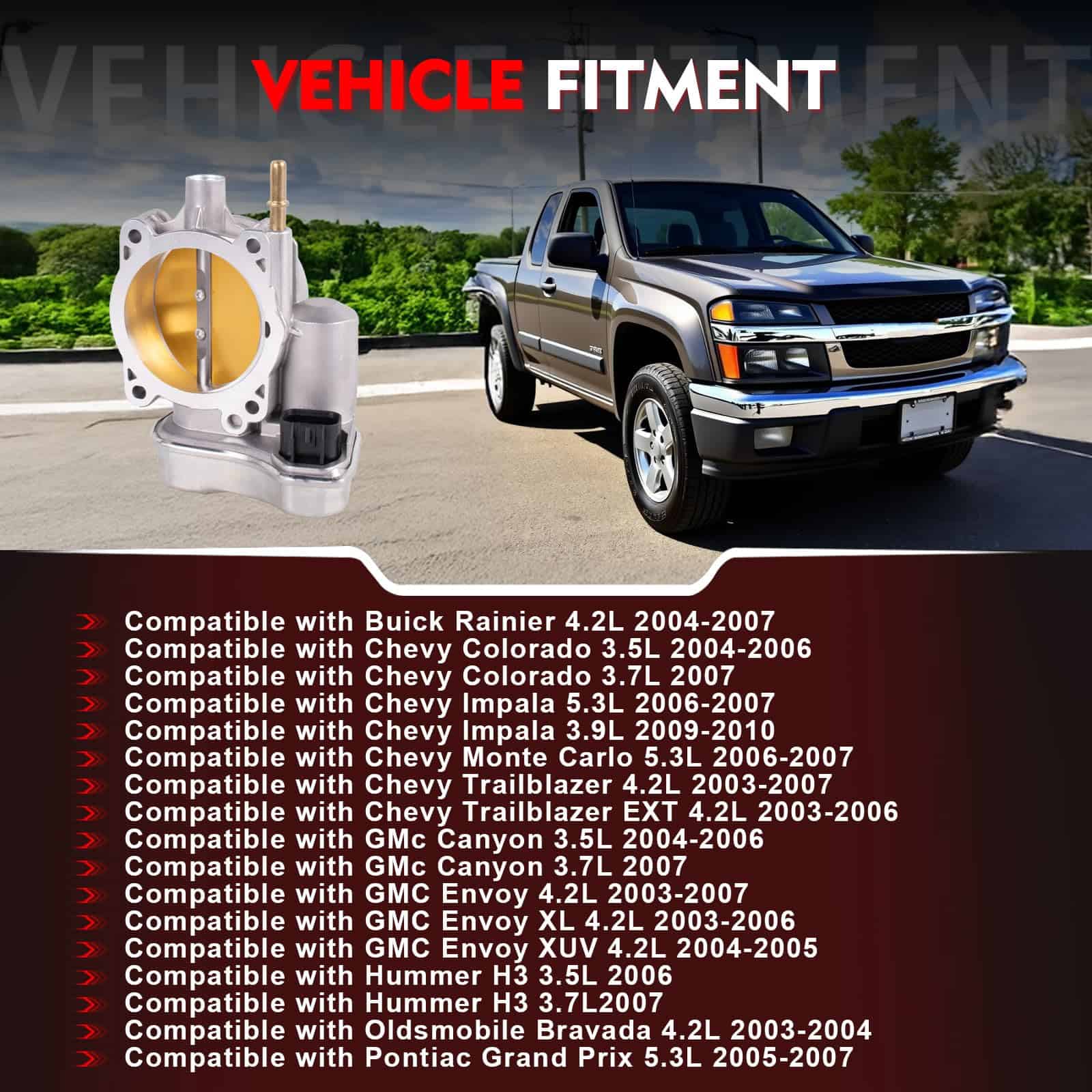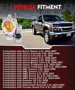 2. Modelos compatibles Este cuerpo del acelerador electrónico es adecuado para Buick Rainier 2004-2007, Chevrolet Colorado 2004-2007, Chevrolet Impala/Monte Carlo 2006-2007, Chevrolet Trailblazer 2003-2007, Chevrolet Trailblazer EXT 2003-2006, GMC Canyon 2004-2007, GMC Envoy 2003-2007, GMC Envoy XL 2003-2006, GMC Envoy XUV 2004-2005, H3 2006-2007, Isuzu Ascender 2003-2007, Isuzu i-350 2006, Isuzu i-370 2007, Oldsmobile Bravada 2003-2004, Pontiac Grand Prix 2005-2007, Saab 9-7x 2005-2007.