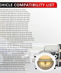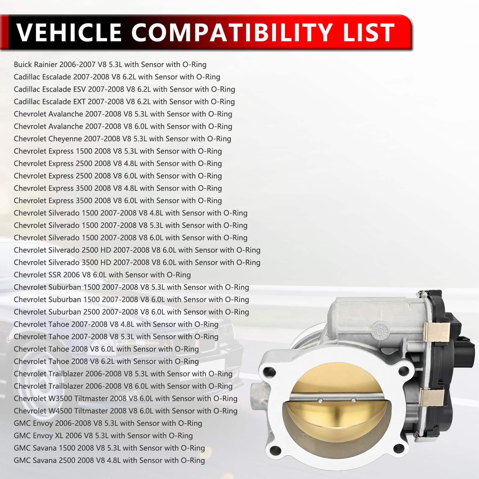 2. Compatibilidad – Cuerpo del acelerador para Chevy Avalanche 2007-2008 V8 5.3L/6.0L; Para Chevy Cheyenne 2007-2008 V8 5.3L; Para Chevy Express 1500 2008 V8 5.3L; Para Chevy Express 2500 2008 V8 4.8L/6.0L; Para Chevy Express 3500 2008 V8 4.8L/6.0L; Para Chevy Silverado 1500 2007-2008 V8 4.8L/5.3L/6.0L; Para Chevy Silverado 2500 HD 2007-2008 V8 6.0L; Para Chevy Silverado 3500 HD 2007-2008 V8 6.0L; Para Chevy SSR 2006 V8 6.0L; Para Chevy Suburban 1500 2007-2008 V8 5.3L/6.0L; Para Chevy Suburban 2500 2007-2008 V8 6.0L; Para Chevy Tahoe 2007-2008 V8 4.8L/5.3L; Para Chevy Tahoe 2008 V8 6.0L/6.2L; Para Chevy Trailblazer 2006-2008 V8 5.3L/6.0L; Para Chevy W3500 Tiltmaster 2008 V8 6.0L; Para Chevy W4500 Tiltmaster 2008 V8 6.0L.