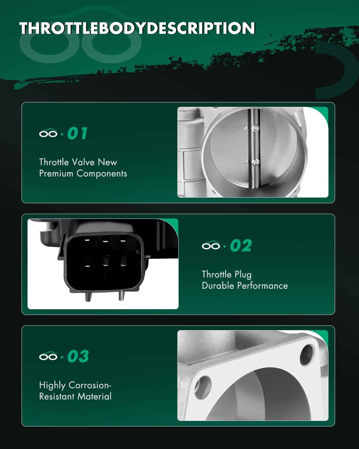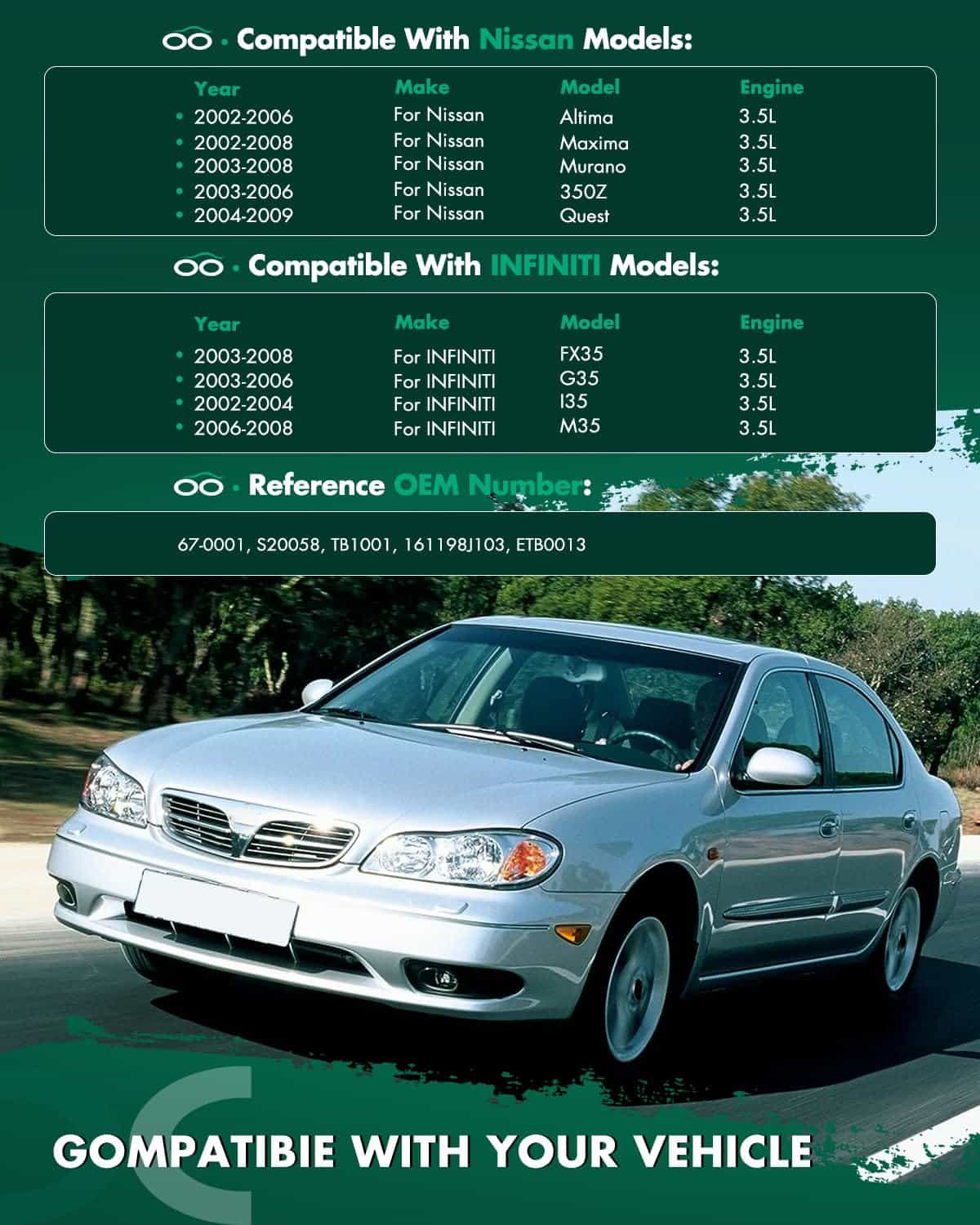 Cuerpo del acelerador SCITOO compatible para Nissan Altima 3.5l 02-06, Nissan Maxima 3.5l 02-08, Nissan Murano 3.5l 03-07, Nissan 350Z 3.5l 03-06, Infiniti FX35 3.5l 03-08, Infiniti G35 3.5l 03-07, Infiniti I35 3.5l 02-04, Infiniti M35 3.5l 06-08, Nissan 350Z 3.5l 03-06, Nissan Altima 3.5l 02-06, Nissan Maxima 3.5l 02-08, Nissan Murano 3.5l 03-07, Nissan Quest 3.5l 04-09. El cuerpo del acelerador SCITOO es una excelente pieza de repuesto para mejorar el rendimiento del motor y la confiabilidad del vehículo. Este cuerpo del acelerador incluye el actuador del acelerador, el control de aire en ralentí y el sensor de posición del acelerador, que han sido diseñados para trabajar juntos de manera más segura y fácil de instalar. Con el cuerpo del acelerador SCITOO, puede esperar una mejor aceleración y desaceleración, lo que mejora la experiencia de conducción en general. Antes de realizar su compra, asegúrese de comprobar la descripción y la tabla de compatibilidad para garantizar que este cuerpo del acelerador sea el ajuste adecuado para su vehículo.