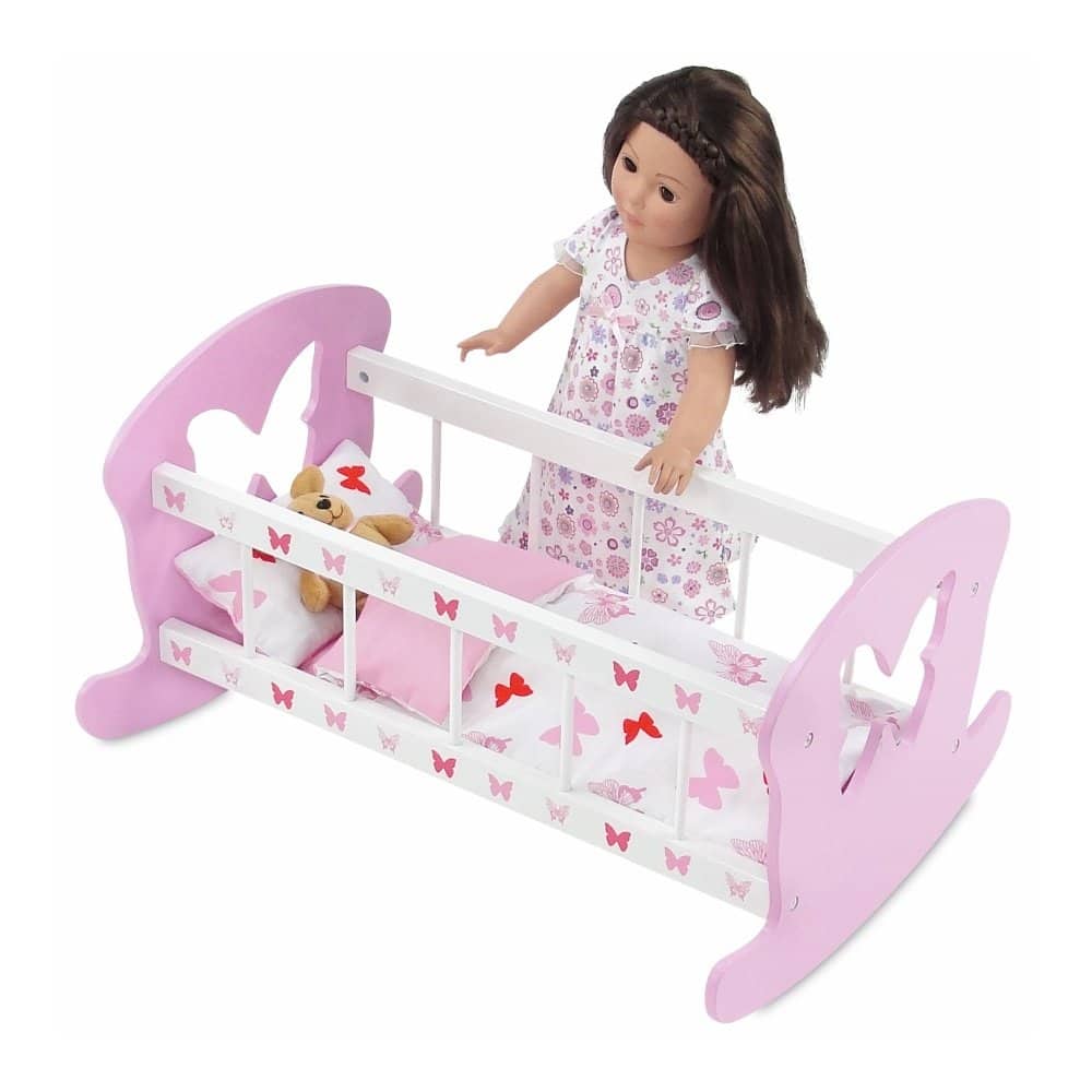 Duradera y resistente, esta preciosa cuna de muñeca de madera rosa y blanca, hecha para adaptarse a muñecas de 14 a 19 pulgadas, tiene un hermoso motivo de mariposas. La cama viene con un conjunto de ropa de cama a juego que incluye un edredón reversible de mariposas/rosa, almohada y colchón, tan grueso y mullido que tu muñeca dormirá como un sueño! Echa un vistazo a otros muebles en nuestra colección temática de mariposas de Emily Rose buscando los números de producto INS1065, INS1066, INS1068, INS1070 o INS1071. Este mobiliario de muñecas está hecho para adaptarse a muñecas de 15 a 18″ como American Girl, Bitty Baby, Baby Alive, etc. Las dimensiones proporcionadas a continuación se basan en el producto completamente ensamblado. Muñeca no incluida
