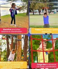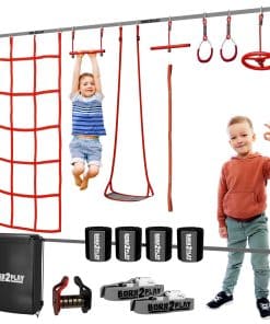 Turn your backyard into an adventure park with the Born 2 Play Ninja Line for Kids. This comprehensive slackline for kids includes a monkey bar, two rope knots and gym rings, a pulley & more, all designed to improve your child’s strength and balance. A secure and reliable ninja course: Our ninja courses for your backyard are made with quality in mind. We’ve chosen premium metal and plastic materials to make sure each component in this outdoor playset withstands endless hours of active play. Play without compromising nature’s beauty by using the four tree protectors in this outdoor kids play equipment set. And to ensure that ages 5 to 12 can join the fun, we’ve provided you with two different slacklines 50ft x 2″ and 50ft x 1″. Vibrant colors to spark imagination: The striking red, silver, and black design of our kids outdoor play equipment will surely capture your child’s attention. Watch them conquer new challenges in these stimulating play sets & playground equipment. Bring the playground anywhere: Whether it’s a park or a camping trip, our double slackline obstacle course kit comes with a convenient drawstring bag to ensure the fun never stops. For a portable ninja warrior course for kids, click ‘ADD TO CART’!