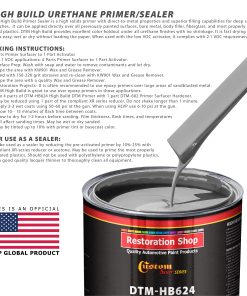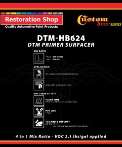 Custom Shop – Gray DTM High Build Urethane Primer Surfacer 2.1 VOC es una imprimación de alto rendimiento con una relación de mezcla de 4 a 1 diseñada específicamente para ser utilizada DTM (Direct to Metal) . La imprimación de la Serie DTM contiene un sistema avanzado de tecnología de resinas que ofrece una adhesión superior al Metal desnudo, Acero, Aluminio sin tratar, Fiberglass, Gelcoat, Rellenos de carrocería y muchos plásticos rígidos preparados adecuadamente y acabados OEM lijados. La imprimación DTM no contiene plomo ni cromato y su formulación contiene una rica mezcla de aditivos anticorrosivos para lograr la defensa máxima contra el óxido y la corrosión mientras agrega el beneficio de una adhesión excepcional. DTM también ofrece propiedades de alto rendimiento y es un producto de secado rápido. Fácil de lijar en tan solo 3 horas. La imprimación de la Serie DTM de Custom Shop es excelente como imprimación DTM con una relación de mezcla de 4 a 1. Y un bajo 2.1 Voc que puede usarse de costa a costa. DTM Primer Surfacer está disponible en gris imprimación con kits de 1-1/4 cuarto y 1-1/4 galón. Ideal para aplicaciones automotrices e industriales. DTM es compatible y puede ser recubierto con la mayoría de las marcas de pintura automotriz como Custom Shop, Restoration Shop, PPG, House of Kolor, Valspar, etc. Custom Shop DTM High Build Primer Surfacer ofrece características superiores de lijado y excelente retención del brillo de la capa superior. Permita que la imprimación se seque durante 2-3 horas antes de lijar y aplicar la capa superior.