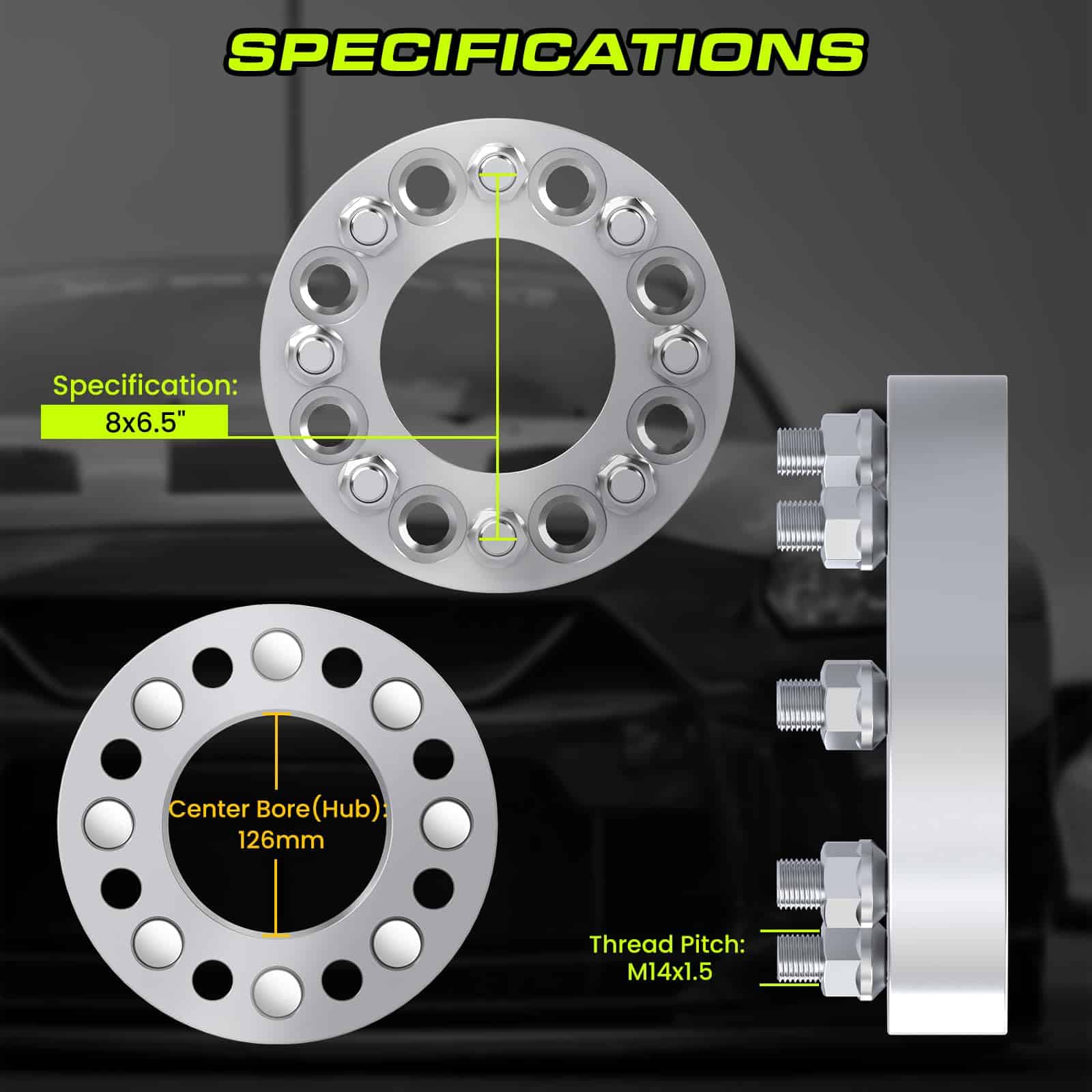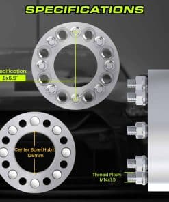 Los separadores de rueda Customadeonly están fabricados mediante el proceso CNC automatizado en nuestro centro de mecanizado de 4 ejes. Entregando calidad y precisión consistentes a cada producto que producimos, lo que elimina el problema de equilibrio que otras marcas pueden tener. Hechos con aluminio de alta calidad 6061 T-6, el material es conocido por su alta resistencia a la tracción y durabilidad. Los separadores están ensamblados con pernos de acero al carbono de clase 10.9 (grado 8 de la SAE). Los separadores de rueda Customadeonly también cuentan con nuestra garantía de reemplazo de producto por 2 años contra cualquier defecto funcional. Si tiene alguna pregunta sobre nuestro producto, no dude en contactarnos, estamos aquí para ayudar. Se ajustan a la aplicación de 8 lug (8×6.5″) de Chevy & GMC con pernos M14x1.5 solamente. Especificación de torque sugerida: 95-100lbs.
