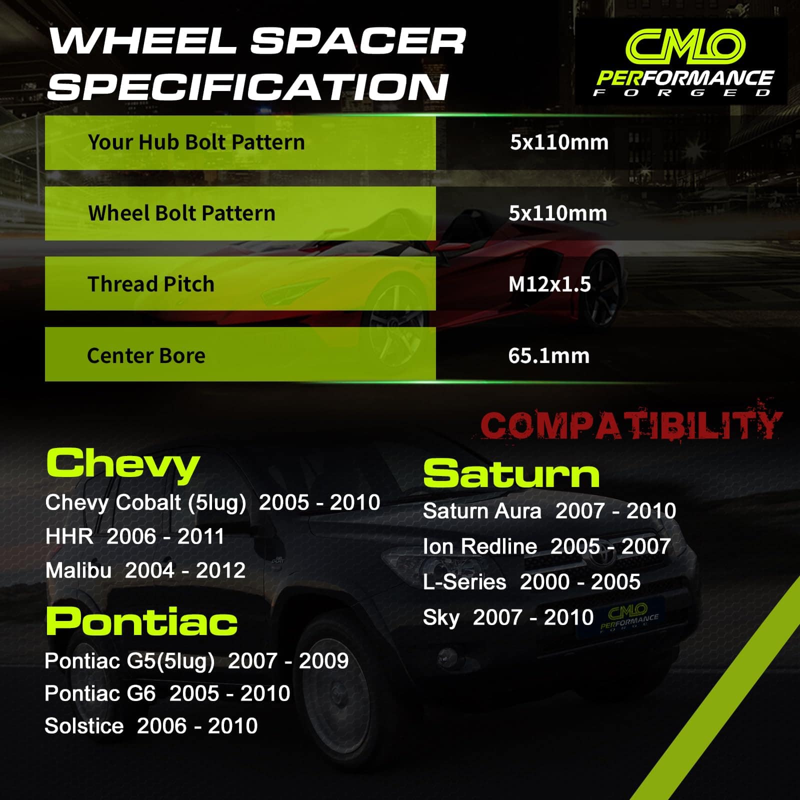 Ancho del Separador: 10mm (Aprox. 3/8″) cada lado Cantidad: 2 Piezas Patrón de Perno: 5X110 a 5X110 Diámetro del Centro: 65mm Rosca: 12×1.5 Tipo de Separador: Centrada en el Cubo La aplicación incorrecta de combinaciones de adaptadores de llantas y ruedas puede reducir la estabilidad del vehículo y causar accidentes y/o lesiones. El uso en cualquier vehículo de ruedas tamaños o tipos no recomendados o especificados por el fabricante del vehículo es bajo el riesgo exclusivo del usuario y anula cualquier garantía expresa o implícita (incluidas la comerciabilidad y la aptitud para un propósito particular). El uso de adaptadores/separadores de ruedas queda a la discreción del usuario. La responsabilidad recae completamente en el usuario. Excepto por la garantía limitada establecida aquí, nuestra empresa no otorga ninguna otra garantía, expresa o implícita, con respecto a los productos y específicamente renuncia a las garantías implícitas de comerciabilidad y aptitud para un propósito particular. En ningún caso nuestra empresa será responsable por daños directos, indirectos, punitivos, incidentales, especiales o consecuentes, a la propiedad o la vida, que surjan o estén relacionados con el uso o mal uso de nuestros productos. Nuestra responsabilidad, si la hay, ya sea en contrato o en agravio o de otra manera, se limita a la cantidad de ventas que recibimos realmente de usted.