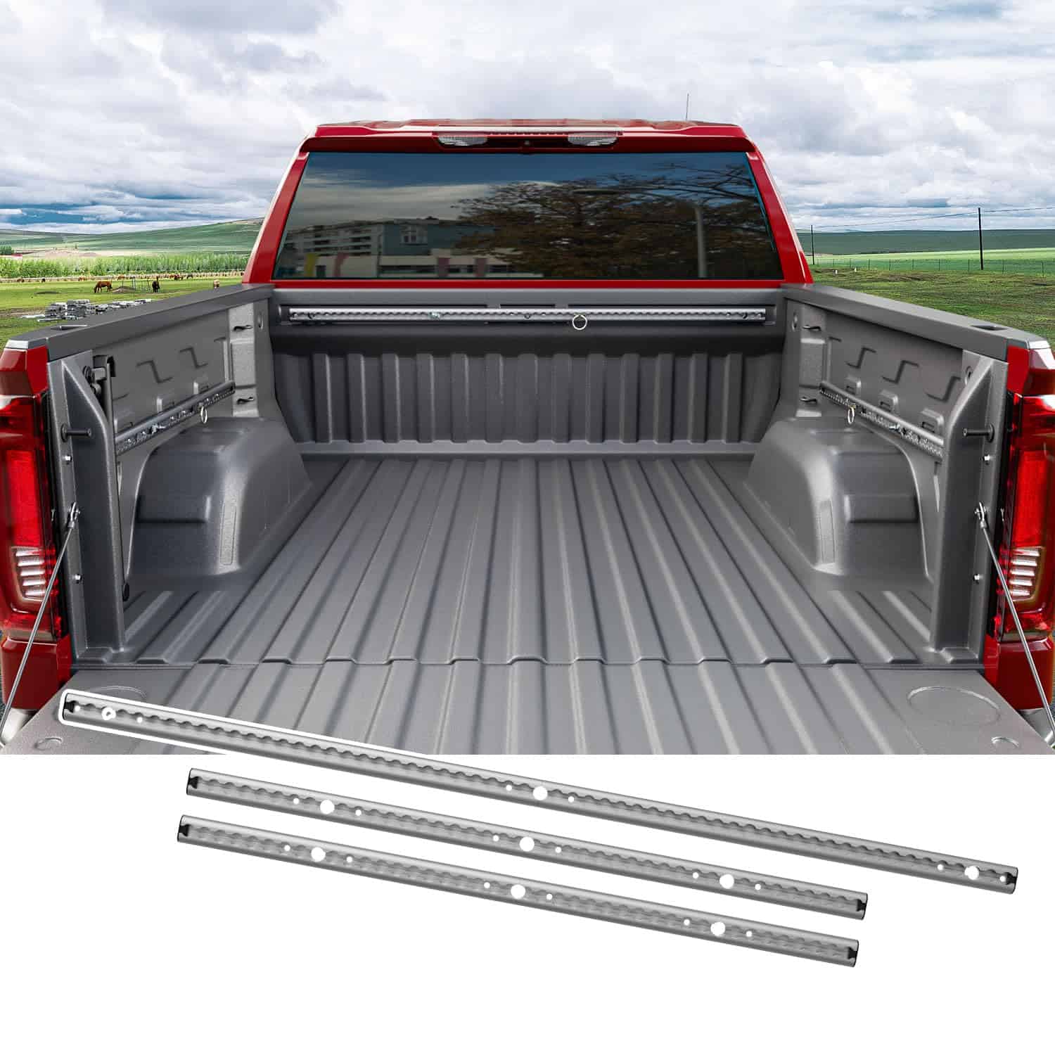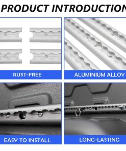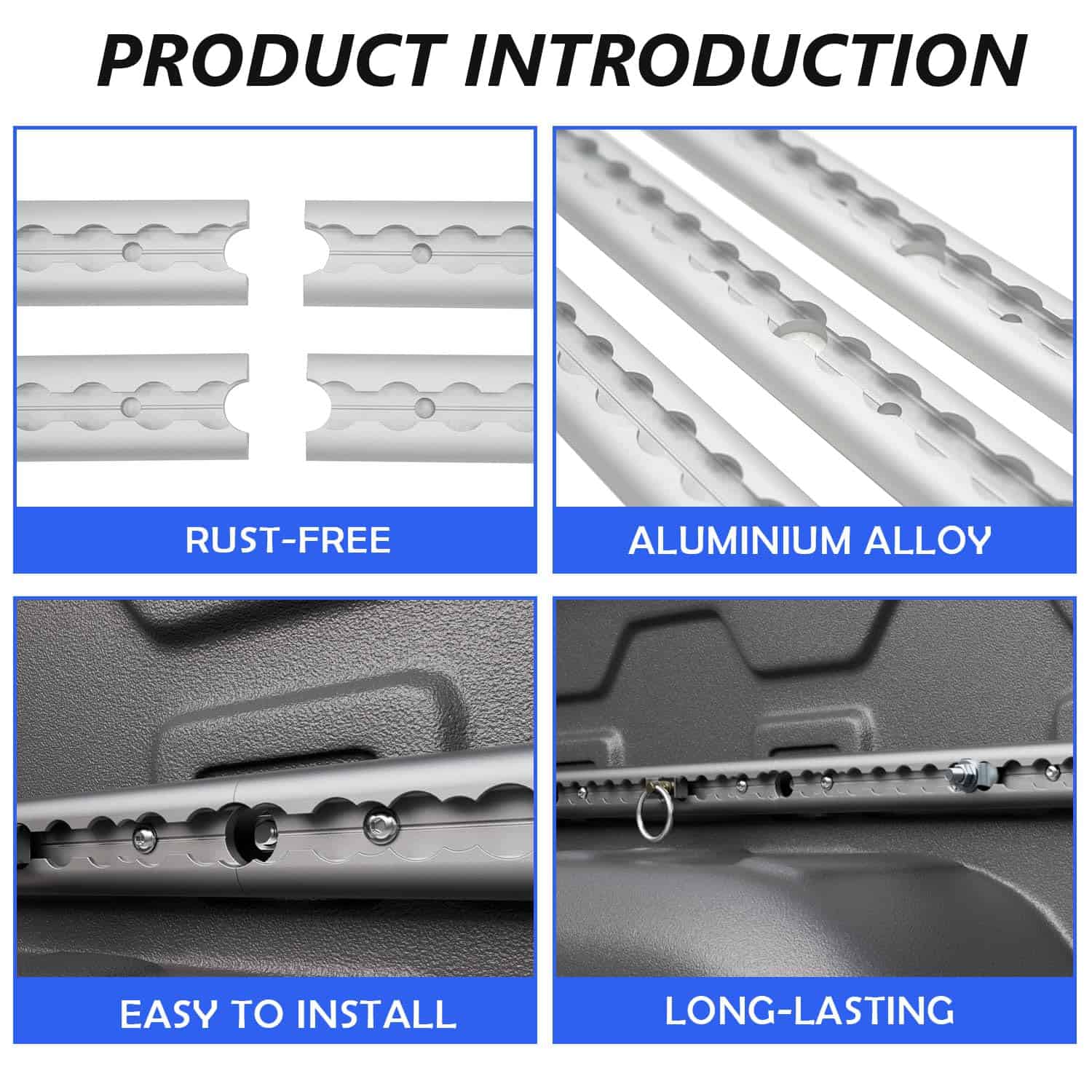 2. Calidad de Material Premium: El sistema de rieles compatible con Chevy Silverado y GMC Sierra 1500 está hecho de una aleación de aluminio resistente. Es extremadamente fuerte para manejar cargas pesadas y uso rudo. Este material no se oxida fácilmente, incluso si se moja por la lluvia o la nieve. Puede confiar en que durará a través de todo tipo de clima y trabajos de transporte pesados. Además, está terminado con un recubrimiento especial que no solo agrega una capa adicional de protección contra los elementos, sino que también le da un aspecto elegante y profesional que hará que su camioneta se destaque.