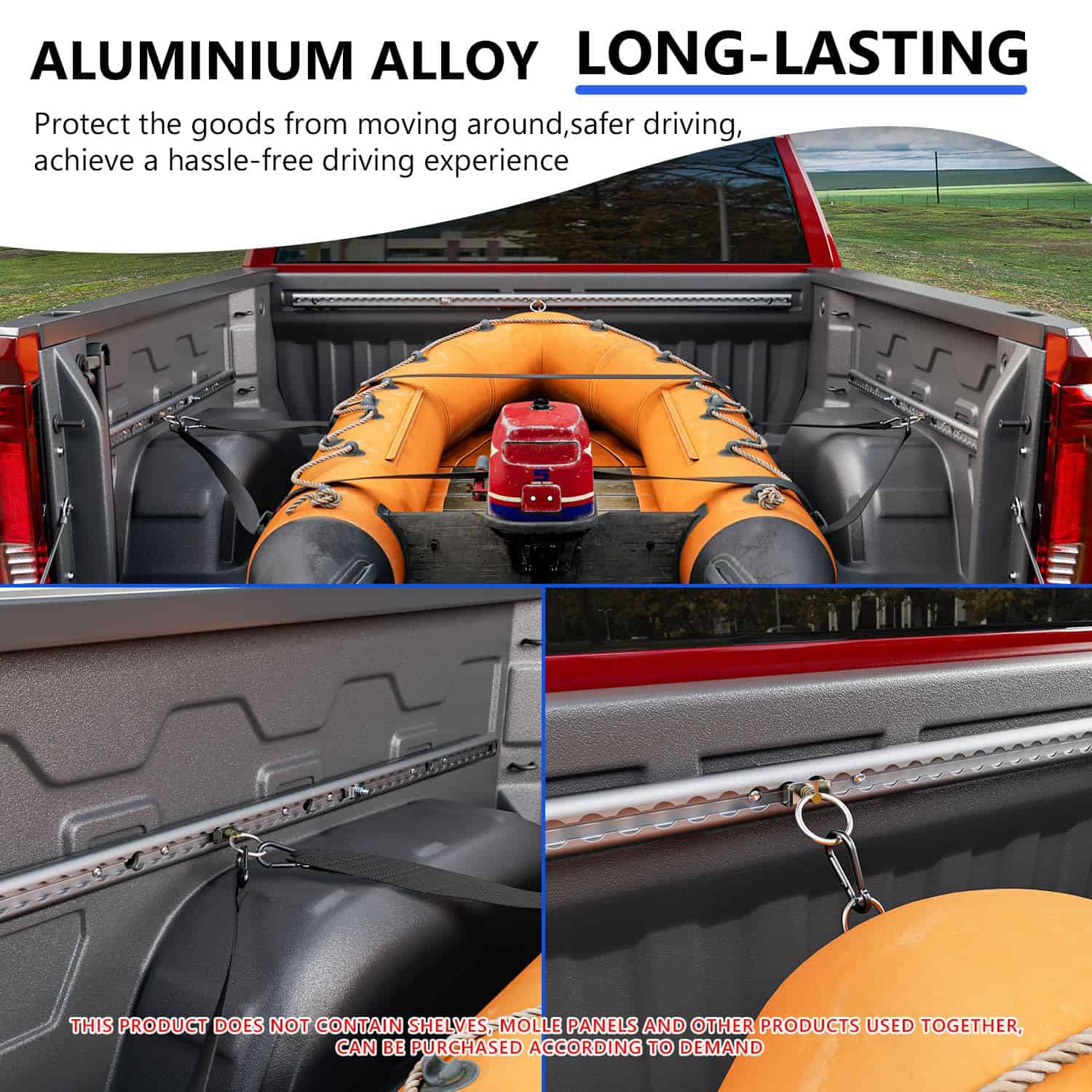 3. Función: El sistema de rieles de reemplazo para el sistema de rieles Chevy Silverado 2019-2025 es una excelente herramienta para administrar el espacio de carga del camión. El pestillo y el tornillo que proporcionamos pueden deslizarse y bloquearse en múltiples posiciones preestablecidas para lograr una carga de carga personalizada. El riel lateral proporciona un excelente soporte para amarrar su carga. Las ranuras y puntos de anclaje facilitan asegurar cuerdas y correas, manteniendo todo en su lugar durante el tránsito. También actúa como un protector lateral, evitando arañazos y abolladuras en la cama de su camioneta.