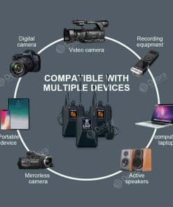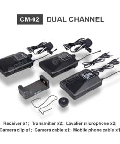 Micrófono profesional inalámbrico CM para fotografía, grabación de video, entrevistas de noticias, conferencias en el aula y otras ocasiones, con una distancia de transmisión de 50 metros. Funciona bien con cámaras DSLR y videocámaras de gama media y alta. Banda de respuesta de frecuencia UHF y circuito libre de interferencias con fuerte capacidad antinterferencias. Sistema de control de valor de ruido y tecnología de control de ruido que pueden reducir en gran medida el ruido y el rango dinámico. Se puede montar en el cinturón o en la cámara fácilmente, ligero y conveniente de llevar y usar. Especificaciones del sistema: Modo de modulación: Modulación de Frecuencia Digital. Frecuencia preestablecida: 30. Respuesta de frecuencia: 75Hz-18kHz ±3dB. Rango de desviación máxima: 50kHz con limitación de nivel. Distorción Armónica Total: 1.0% @ 1kHz. Relación Señal/Ruido: 98dB. Rango de trabajo: Hasta 50m. Estabilidad de Portadora de RF: 0.005% -10 -50. Receptor: Dimensión: 110 x 65 x 25 mm. Alimentación: 3V. Consumo de Energía: 100mA. Vida de la Batería: 6 horas. Transmisor: Frecuencia de Portadora del Transmisor: 30mw. Tiempo de Trabajo: 10 horas. Dimensión: 110 x 65 x 25 mm. Peso: 50g. Antena: Flexible. Conector de Entrada de Audio: Jack mini de 3,5mm. Nota: La cámara y el smartphone no están incluidos. (El canal simple no se puede usar con el canal doble), las baterías no están incluidas en la caja.
