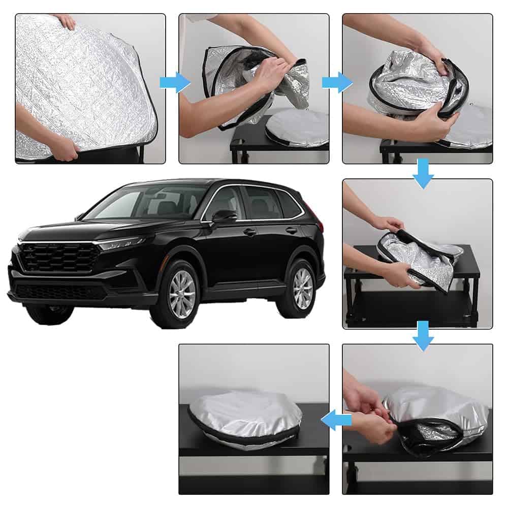 Protector de parabrisas compatible con Honda CR-V (LX, EX, EX-L, EX-L Navi, Touring) 2023 2024 2025. Realizado con material PEVA de aluminio, algodón en aerosol y tela de poliéster reflectante 240T para una mayor durabilidad. Se compone de capas dobles reflectantes y capas térmicas triples para un sombreado y aislamiento más efectivos. El protector de sol para CRV protege el interior del automóvil de los rayos UV y el calor excesivo. Fácil de instalar y almacenar, diseñado para un ajuste perfecto. Perfecto para mantener su vehículo fresco y protegido en climas calurosos.