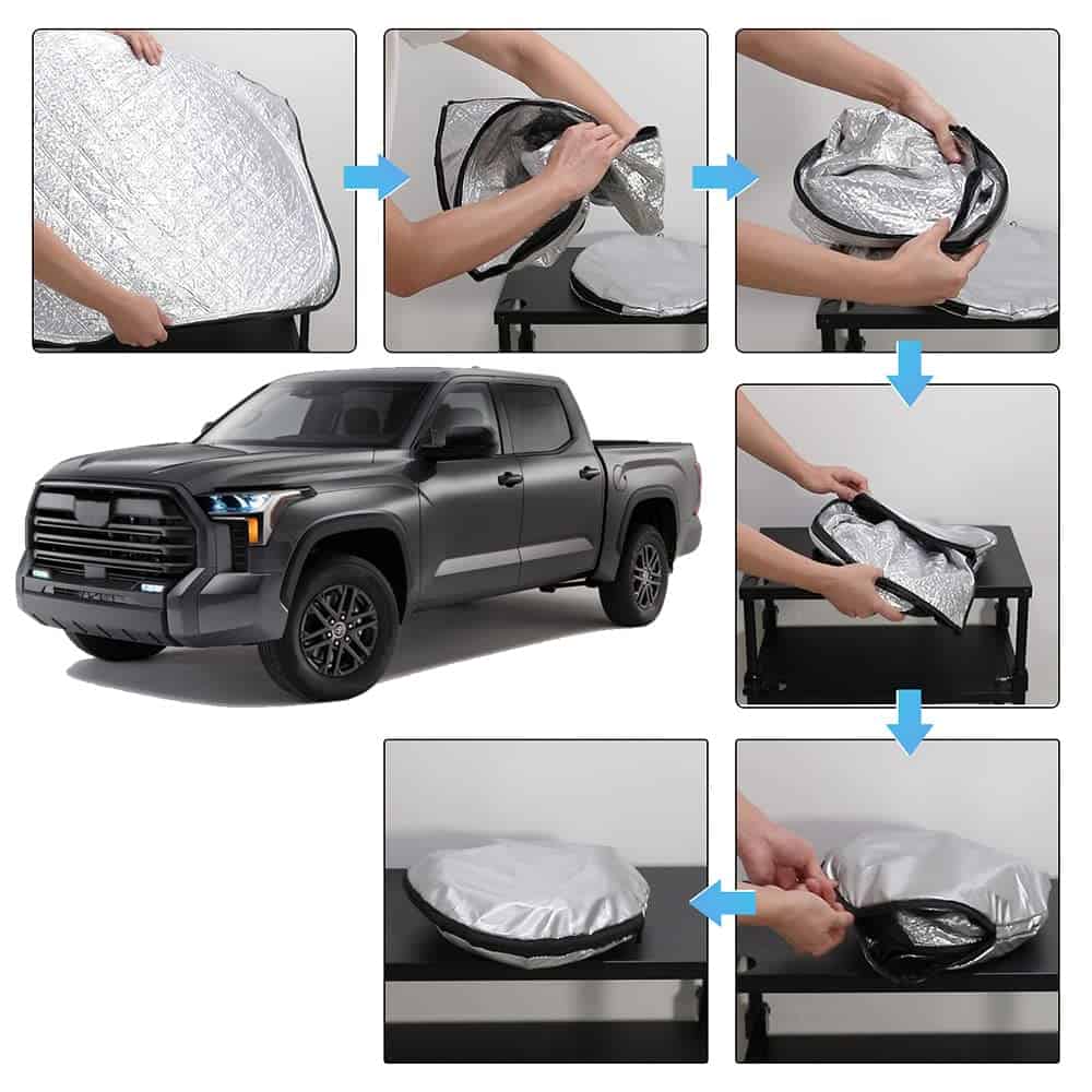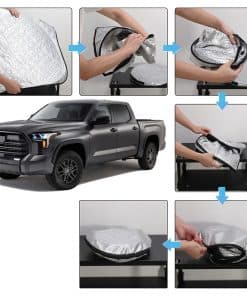 – El aire acondicionado funciona más rápido y fácilmente: utilizando menos energía y gas en lugar de tener que esperar 15 minutos para que tu aire acondicionado enfríe tu coche, el aire acondicionado enfría más rápido y fácil. Ahorra tu dinero mientras haces que tu viaje sea mucho más cómodo y agradable. Fácil de instalar y almacenar: con un ajuste preciso, solo necesitas alinear e instalar, estable y sin desplazamientos. El parasol para parabrisas Tundra es fácil de almacenar debido a su fuerte elasticidad y capacidad de plegado.
