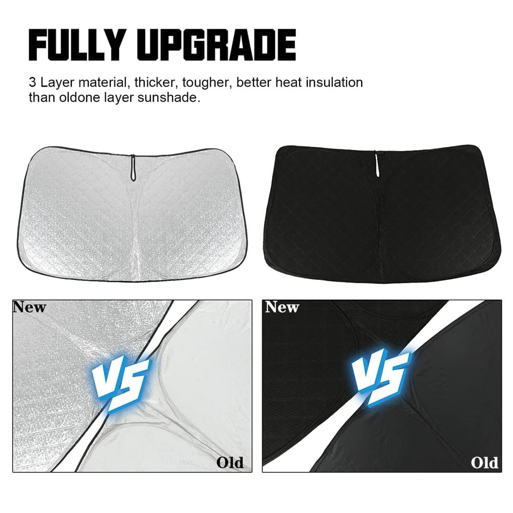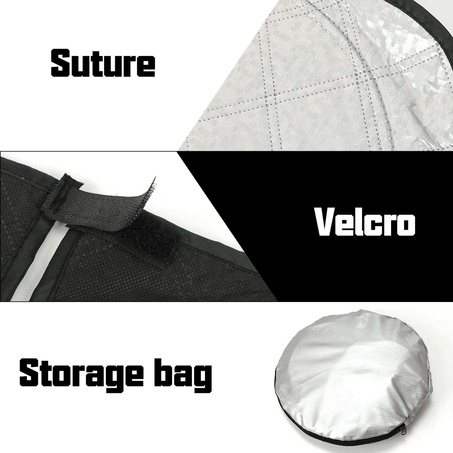 2. Material de 3 Capas Actualizado: El parasol de Silverado está hecho de aluminio PEVA, algodón en spray y tela de poliéster reflectante 240T (más duradero y grueso que el material 210T), nuestro parasol está compuesto por capas dobles reflectantes y 3 capas aislantes térmicas que hacen que el sombreado y la aislación sean más efectivos, mantiene tu vehículo fresco y protegido contra los daños causados por el intenso sol.