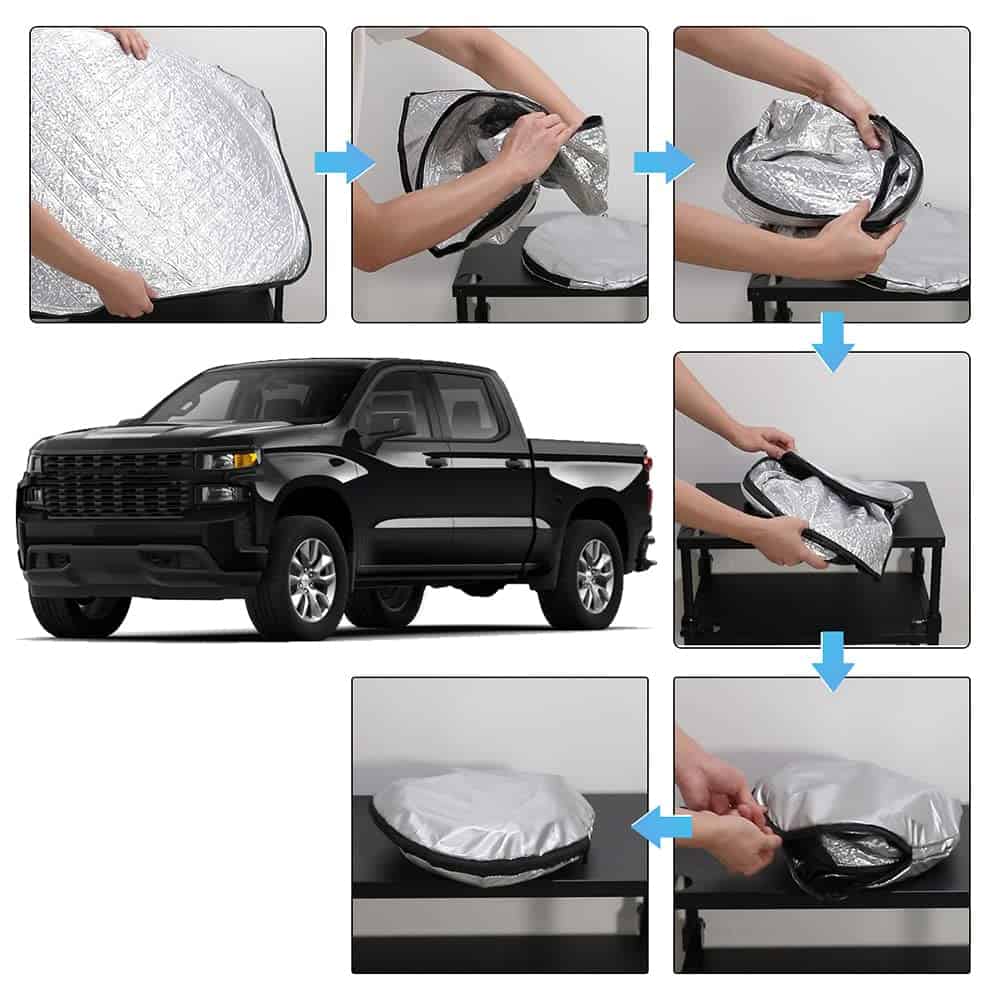 3. El Aire Acondicionado Funciona Más Rápido y Fácil: Usando menos energía y gas en lugar de tener que esperar 15 minutos par abordar la refrigeración de tu coche, el aire acondicionado se enfría más rápido y fácil. Ahorra dinero mientras haces que tu conducción sea mucho más cómoda y placentera. Fácil de instalar y almacenar: con un ajuste preciso, solo necesitas alinear e instalar, estable y sin desplazamientos. El parasol del parabrisas de Silverado es fácil de almacenar debido a su fuerte compresibilidad y plegabilidad.