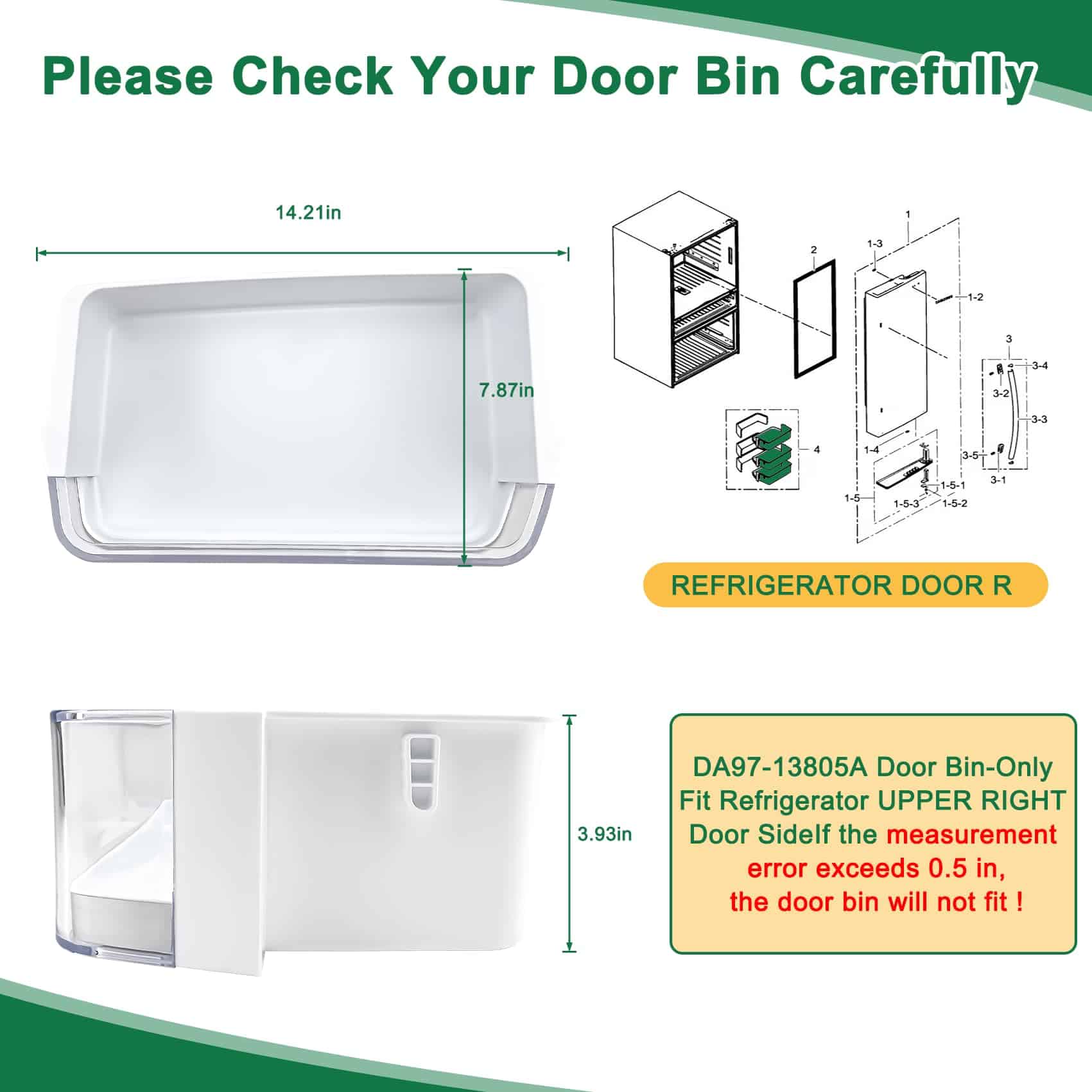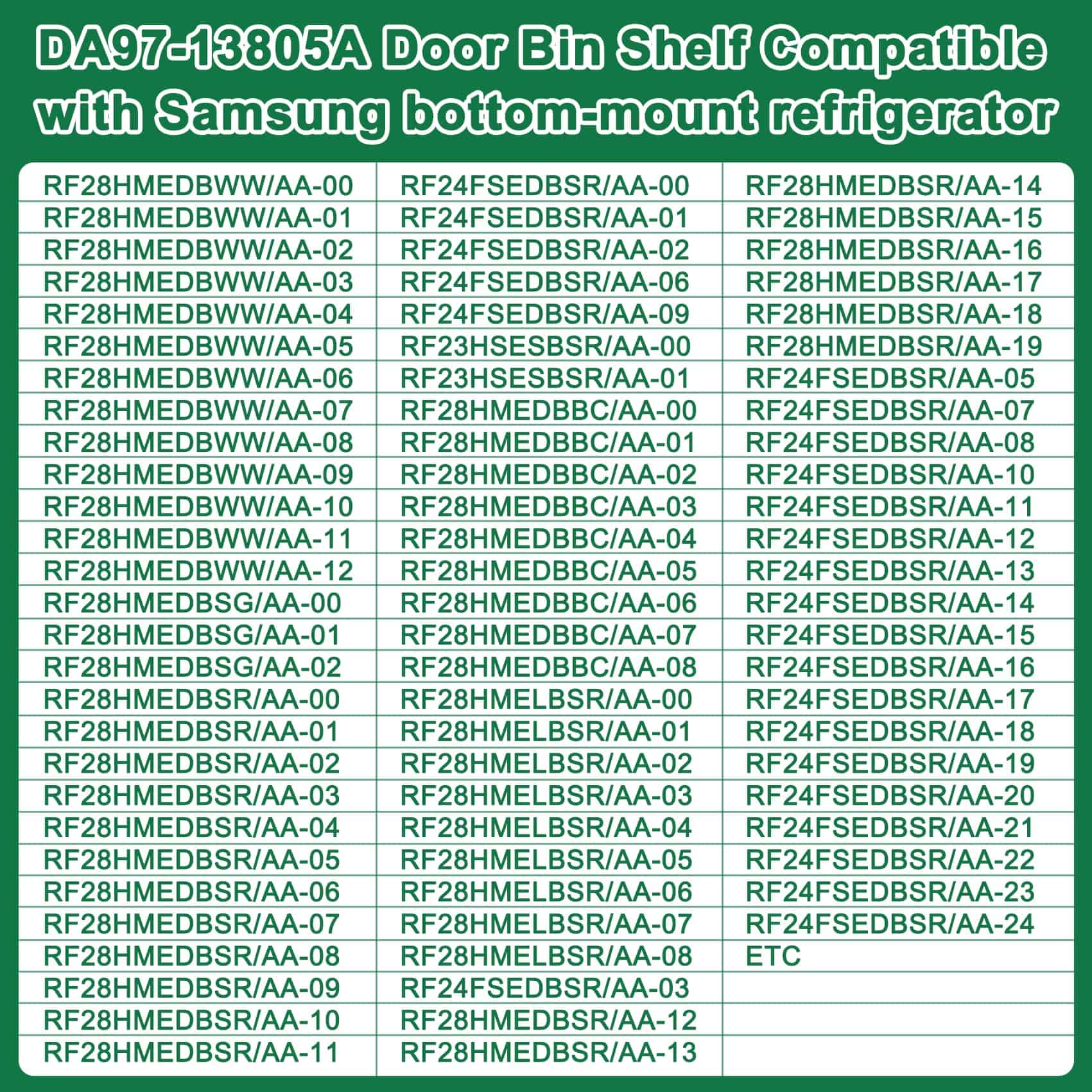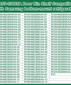 La bandeja de puerta DA97-13805A es una opción de calidad superior para reemplazar la bandeja de puerta dañada o desgastada de su refrigerador Samsung. Este modelo es compatible con una variedad de modelos Samsung, incluyendo RF28HMEDBWW/AA-12, RF28HMEDBSG/AA-01, RF28HMEDBSR/AA-09, RF24FSEDBSR/AA-02, RF23HSESBSR/AA-00, entre otros.
