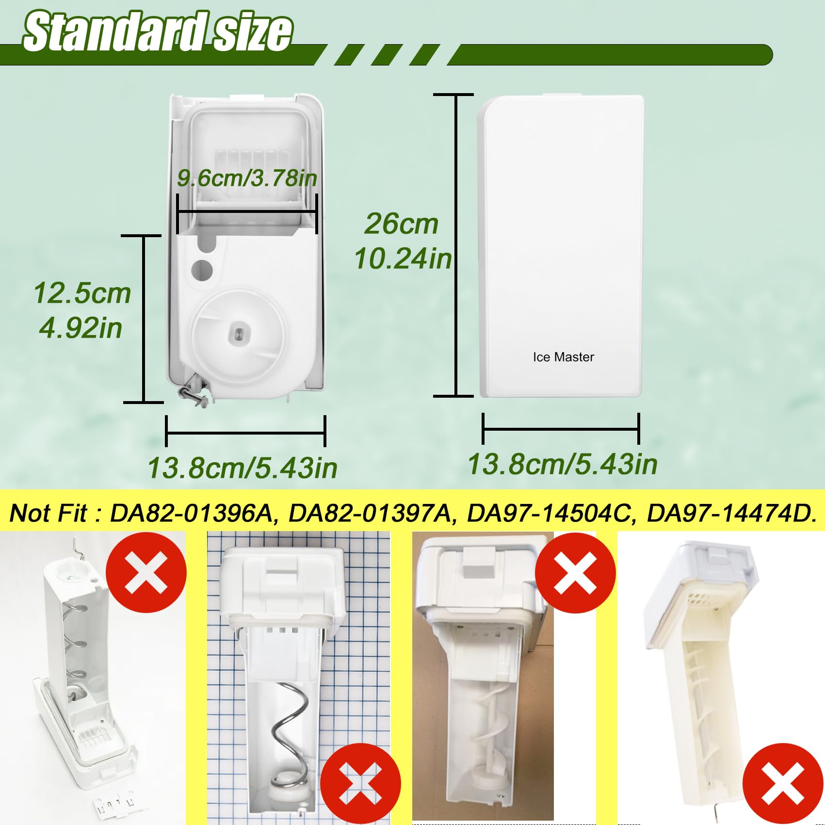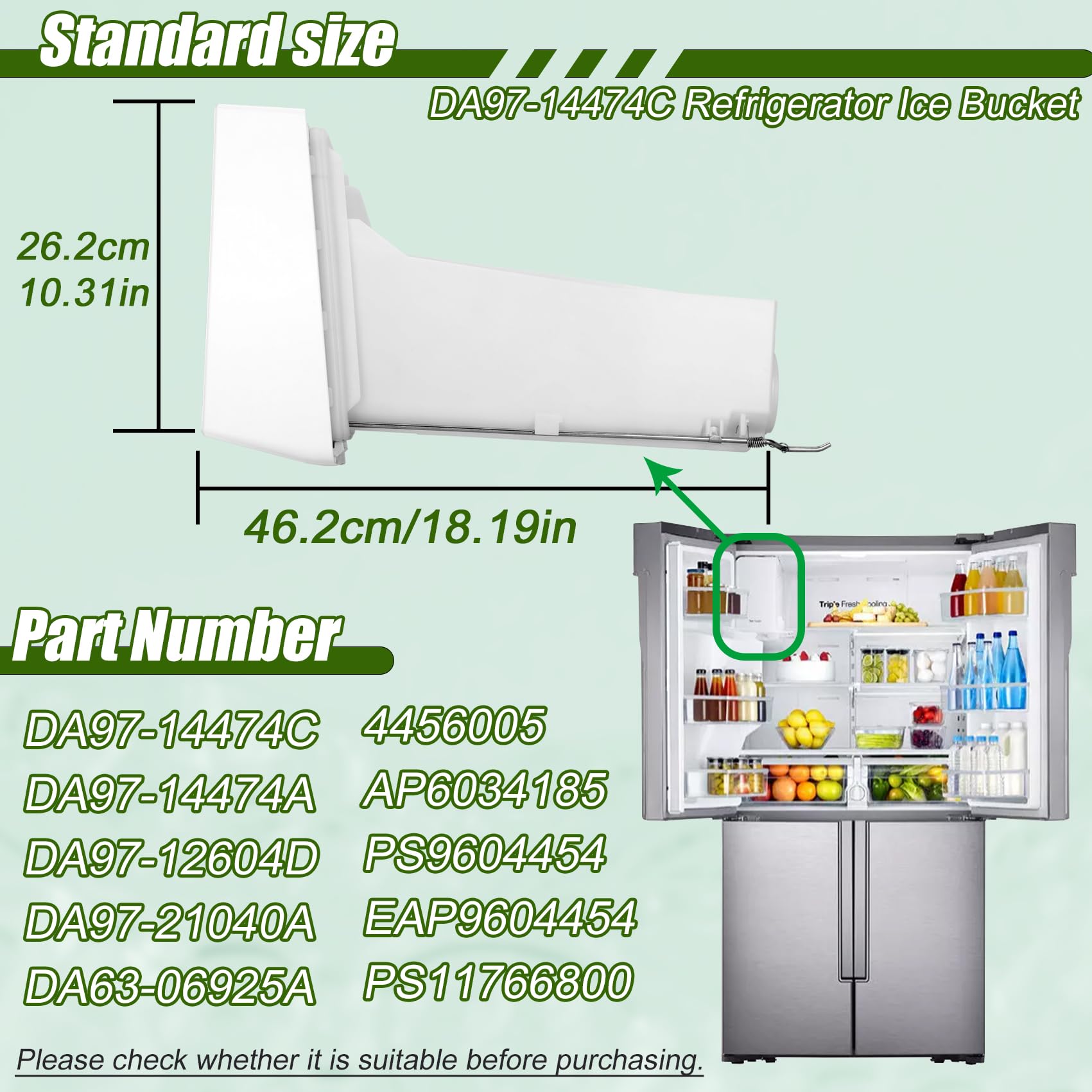 Contenedor de hielo DA97-14474C de alta calidad, compatible con refrigeradores Samsung. Número de parte: DA97-14474C, DA97-14474A, DA97-12604D, DA97-21040A, AP6034185, 4456005, PS9604454, EAP9604454, PS11766800, DA63-06925A. Por favor, revise antes de comprar. Algunos se parecen, pero no se ajustan a DA82-01396A, DA82-01397A, DA97-14504C, DA97-14474D. Modelo aplicable: RF25HMEDBBC, RF25HMEDBWW, RF25HMIDBSG, RF263BEAEBC, RF263BEAESG, RF263BEAESP, RF263BEAEWW, RF263TEAEBC, RF263TEAESG, RF263TEAESR, RF263TEAEWW, RF265BEAESG, RF265BEAESR, RF26J7500BC, RF26J7500WW, RF26J7510SR, RF27T5201SG, RF27T5201WW, RF27T5241SG, RF27T5241SR, RF27T5501SR. Todos los modelos se muestran en la página de detalles. Fácil de instalar, simplemente retire el viejo y reemplace el contenedor de hielo con el nuevo. El nuevo fabricante de hielo DA97-14474A está fabricado por fábricas y trabajadores profesionales, duradero, fácil de limpiar, no es fácil de dañar, mayor vida útil.