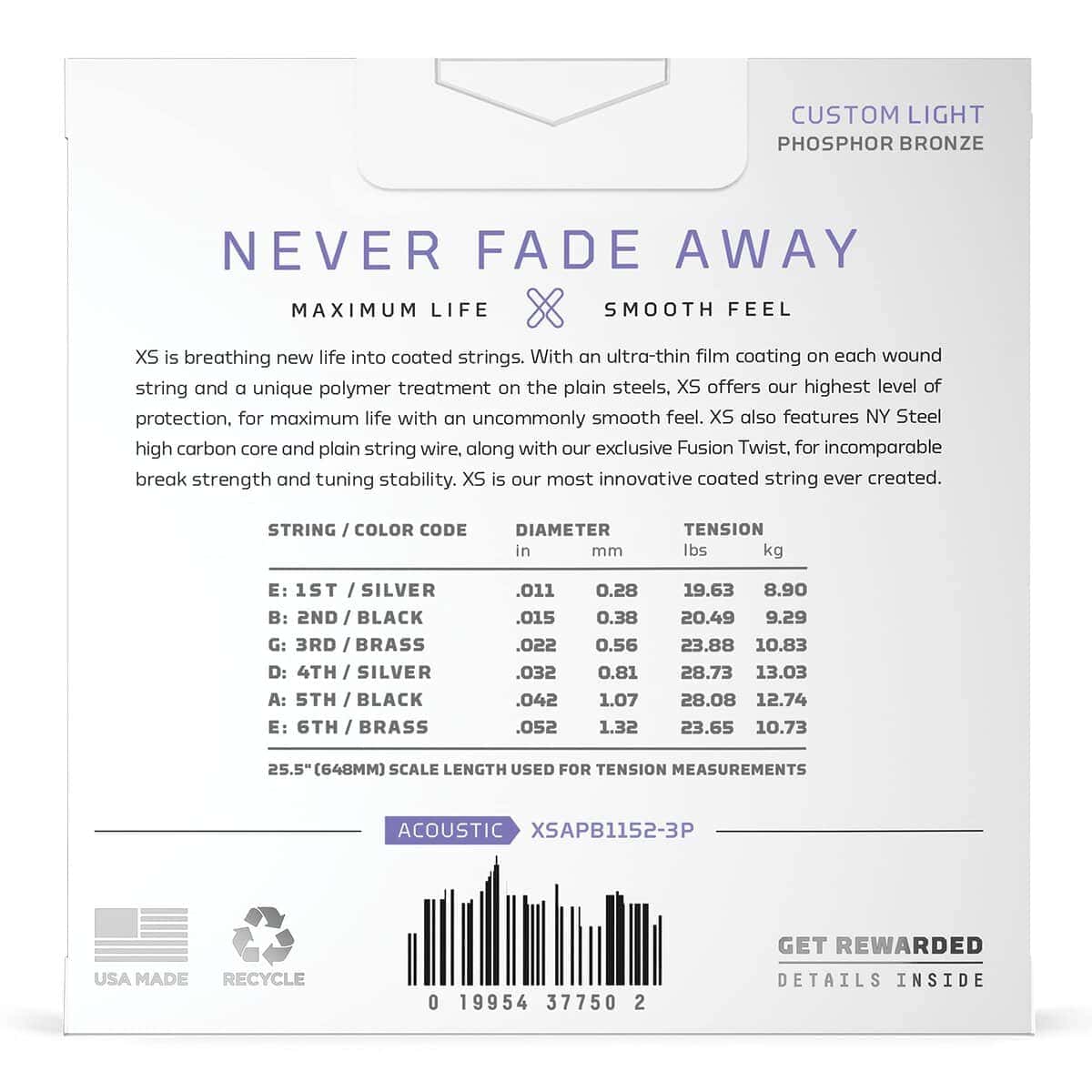 Nacidas de nuestro mayor avance en innovación de cuerdas, las cuerdas de XS Bronce Fosforado tienen la vida más larga de cualquier cuerda de guitarra acústica D Addario. El recubrimiento XS le da a nuestras cuerdas de bronce fosforado cálido y equilibrado una vida máxima, con una sensación inusualmente suave. Hechas con un núcleo de Acero NY, alambre de envoltura de bronce fosforado y tecnología Fusion Twist, las cuerdas de guitarra acústica XS recubiertas tienen una resistencia al quiebre incomparable y una estabilidad de afinación, además de su vida útil dramáticamente aumentada. Este set de calibre Custom Light 11-52 tiene un volumen y proyección ligeramente mayores que Extra Light, aunque sigue siendo fácil de tocar. XS está dando nueva vida a las cuerdas recubiertas. Con su recubrimiento de película ultra delgado en cada cuerda envuelta y tratamiento de polímero único en los aceros al aire, XS ofrece nuestro nivel más alto de protección para una vida máxima con una sensación inusualmente suave. XS también cuenta con núcleo de alto carbono NY Steel y alambre de cuerda lisa, junto con nuestro exclusivo Fusion Twist, para una resistencia al quiebre y estabilidad de afinación incomparables. XS es la cuerda recubierta más innovadora jamás creada.