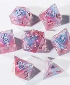 Juego de dados de 7 piezas hechos a mano de resina epoxi de alta calidad y alta transparencia con bordes afilados y hermosas inclusiones para DND TTRPG, Colecciones y Regalos. Incluye D4, D6, D8, D10, D%, D12, D20. Siempre nos especializamos en estos dados artísticos con una actitud de búsqueda de la perfección y un alto grado de pasión. Esperamos que estos originales dados hechos a mano puedan brindar una mejor experiencia de juego y un mejor estado de ánimo para los jugadores.