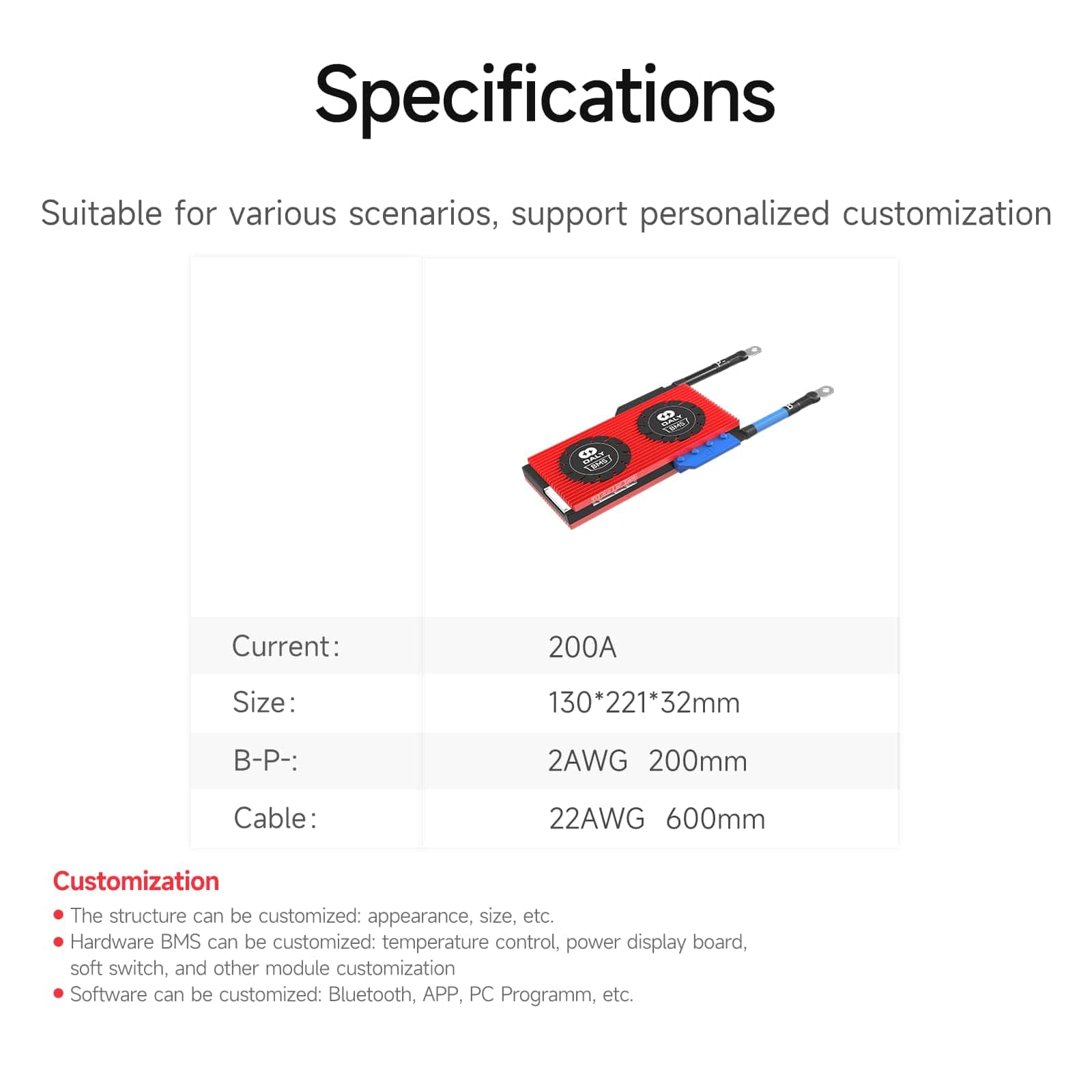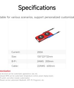 Este es el DALY smart bms clasificado 3.2V con función de comunicación inteligente (UART). Las cadenas de paquetes de baterías deben coincidir con las cadenas de BMS. DALY BMS Adopta una solución de CI de alta calidad (Nivel A) que hace que la gestión de la batería sea mucho más eficiente, ayudando en gran medida a mantener saludable y estable el paquete de baterías. Extendiendo la vida útil de la batería, mejorando el rendimiento. La prueba de impermeabilidad DALY BMS, resistencia a la humedad. DALY BMS puede aplicarse en sistemas de almacenamiento de energía en el hogar, suministro de energía para RV, bicicleta eléctrica y otros dispositivos relacionados con baterías de litio. Configuración predeterminada de fábrica: Voltaje de detección de sobrecarga: 3.75 ± 0.05 V Voltaje de liberación de sobrecarga: 3.65 ± 0.05 V Retardo de protección de sobrecarga: 1s Voltaje de detección de equilibrio: 3.2V Corriente de equilibrio: 35 ± 5 mA Voltaje de detección de sobre descarga: 2.2 ± 0.1 V Retardo de detección de sobre descarga: 1s Voltaje de liberación de sobre descarga: 2.3 ± 0.1 V Consumo de corriente de trabajo del BMS: 20 mA