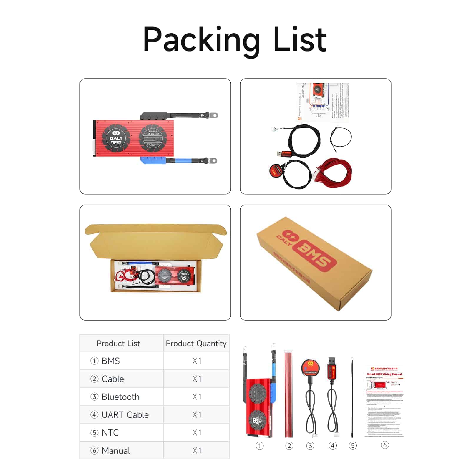 5. Lista de Embalaje BMS Lifepo4 de 3.2V 1, Módulo Bluetooth 1, Sensor NTC 1, Cable de muestreo 1, Cable Uart 1, Manual de Instrucciones 1.