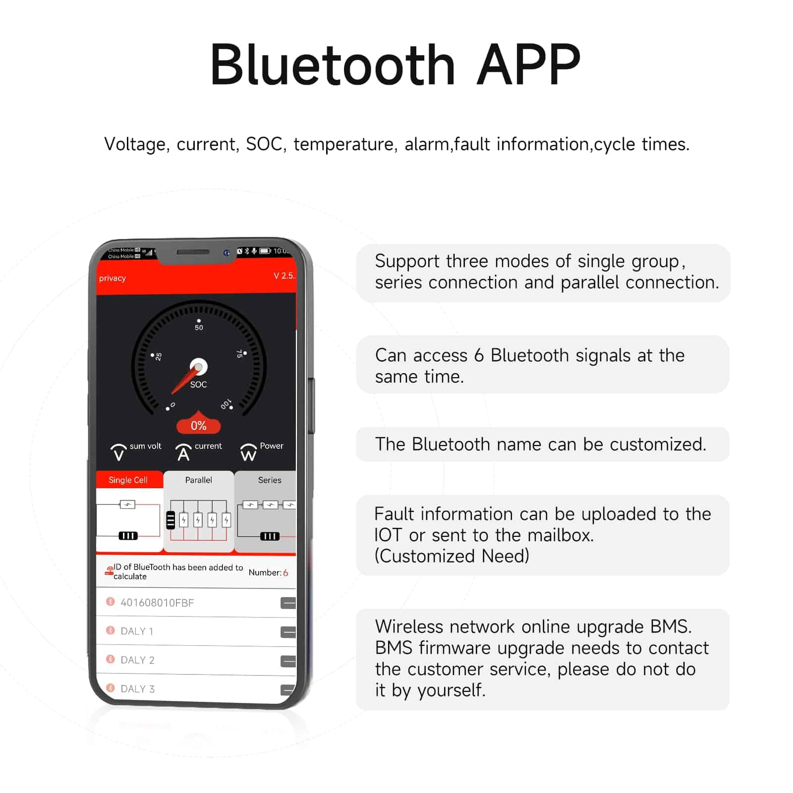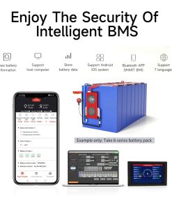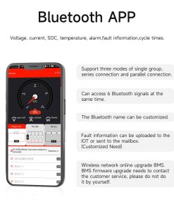 3. Smart BMS Verifique el estado de la batería y modifique los parámetros en cualquier momento a través de la aplicación Bluetooth o el software de PC. Garantía de Calidad: APROBADO ISO/ FCC/ RoHS/ PSE/ CE.