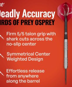 Shot! Darts ha creado este juego de dardos Osprey de la serie Birds of Prey para elevar tu experiencia de juego de dardos. Cada detalle ha sido cuidadosamente diseñado para proporcionar un rendimiento excepcional y un estilo único. Estos dardos de punta de acero de 23g, 24g, 26g o 28g están hechos con un barril de tungsteno 90% de primera calidad que ofrece una distribución de peso centrada para mejorar el equilibrio y la precisión en tus lanzamientos.