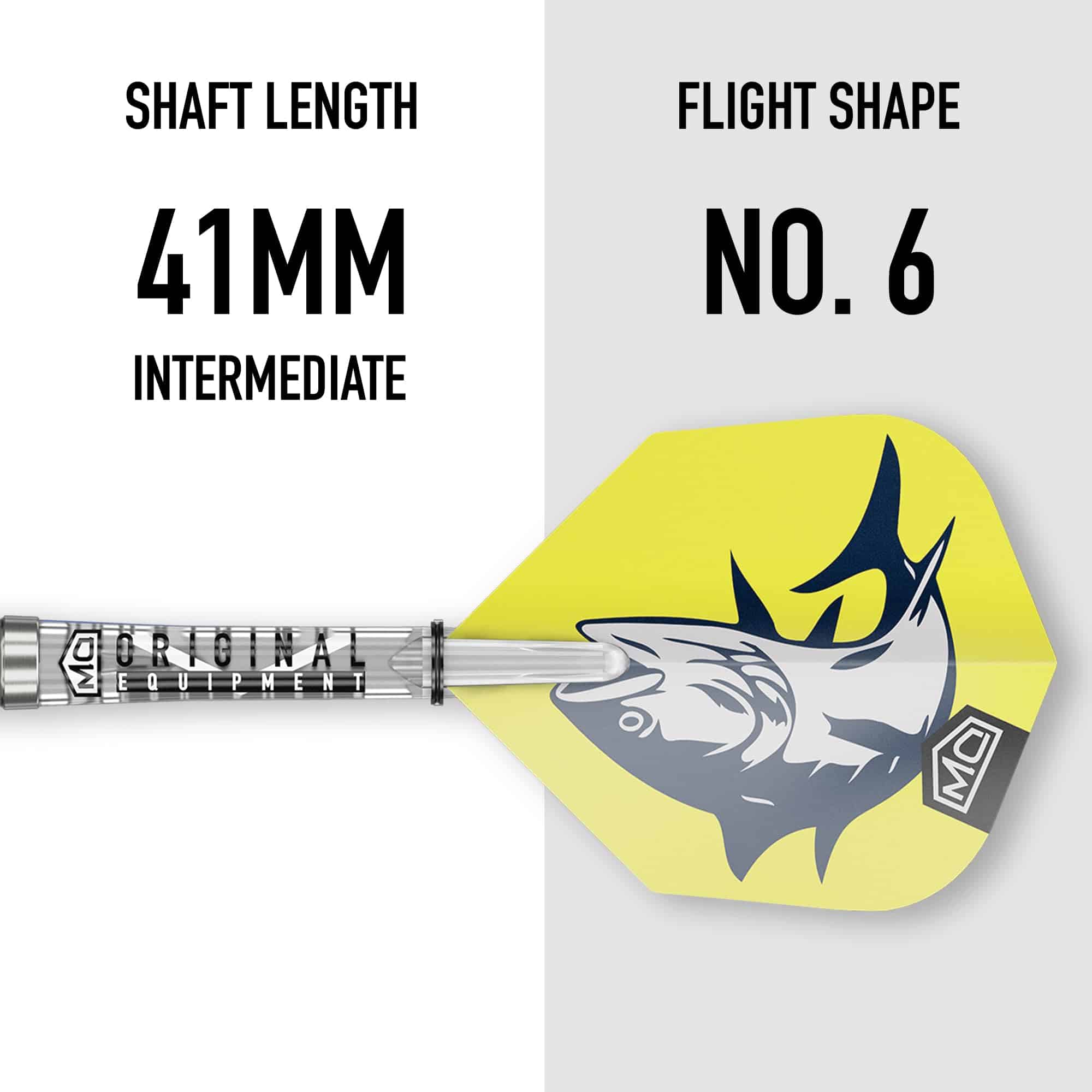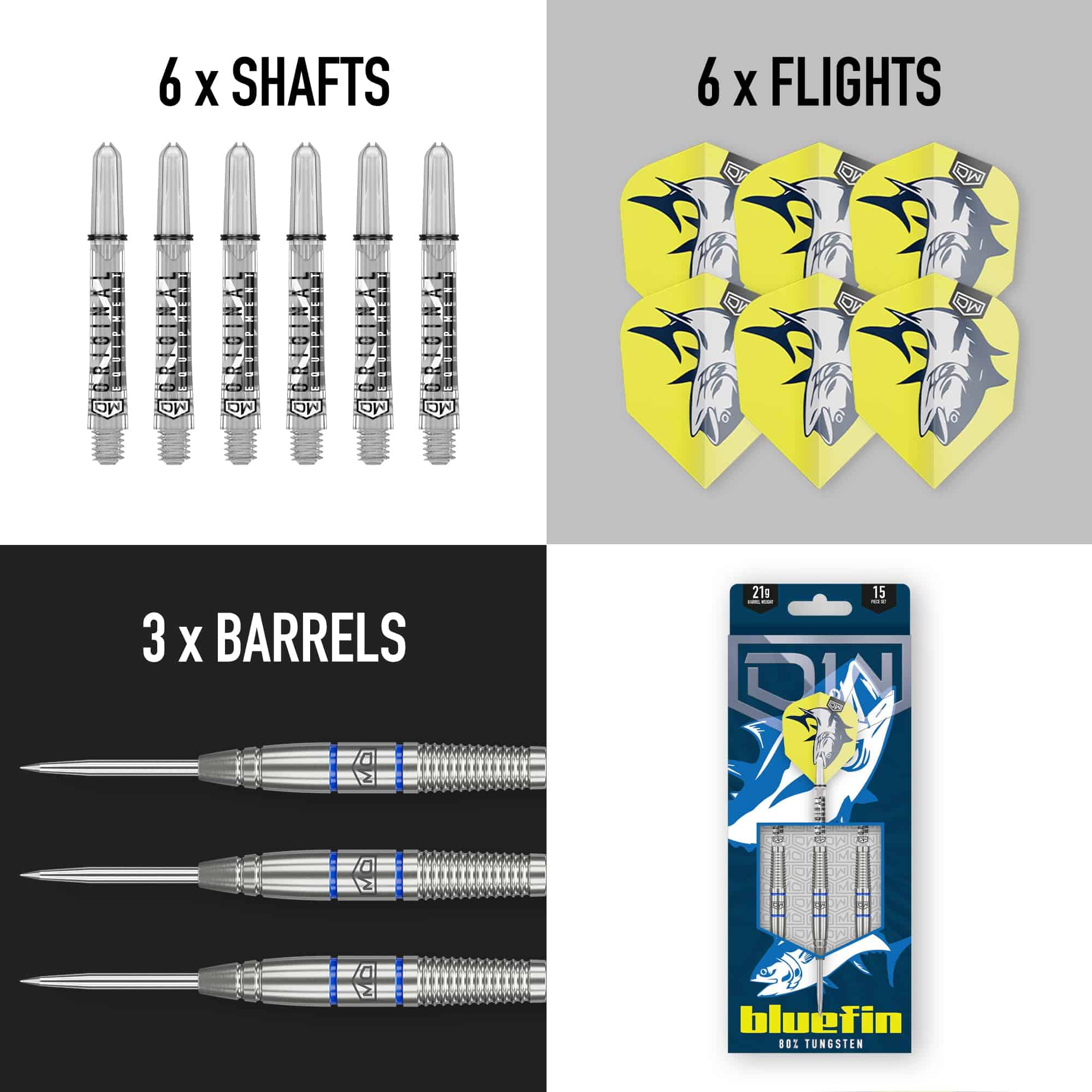 Inspirados por la velocidad y agilidad de caza del atún bluefin, los dardos Bluefin cuentan con un barril delgado de 80% de tungsteno, con una nariz cónica que se asemeja a la forma aerodinámica del cuerpo del pez. El barril en sí es en forma de torpedo, al igual que la forma aerodinámica de un atún bluefin, mejorando tanto la aerodinámica como el control. Los acentos de pintura azul añadidos imitan el aspecto aerodinámico de un atún cortando el agua cuando está en vuelo. Fabricados con un compuesto de nailon duradero, los ejes Clinch están fabricados utilizando un proceso de moldeo especializado e incluyen anillos en O para una conexión segura entre vuelo y eje, junto con una rosca universal 2BA. Los vuelos de dardos en forma de Nº 6 cuentan con un gráfico feroz del atún bluefin, en contraste con un fondo amarillo vibrante, fabricados en material de polietileno de 100 micrones, proporcionando una estructura ligera y duradera. El set de dardos de punta de metal se completa con puntas de acero fijo de 26mm.
