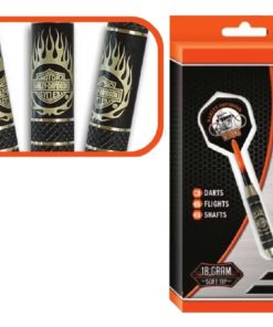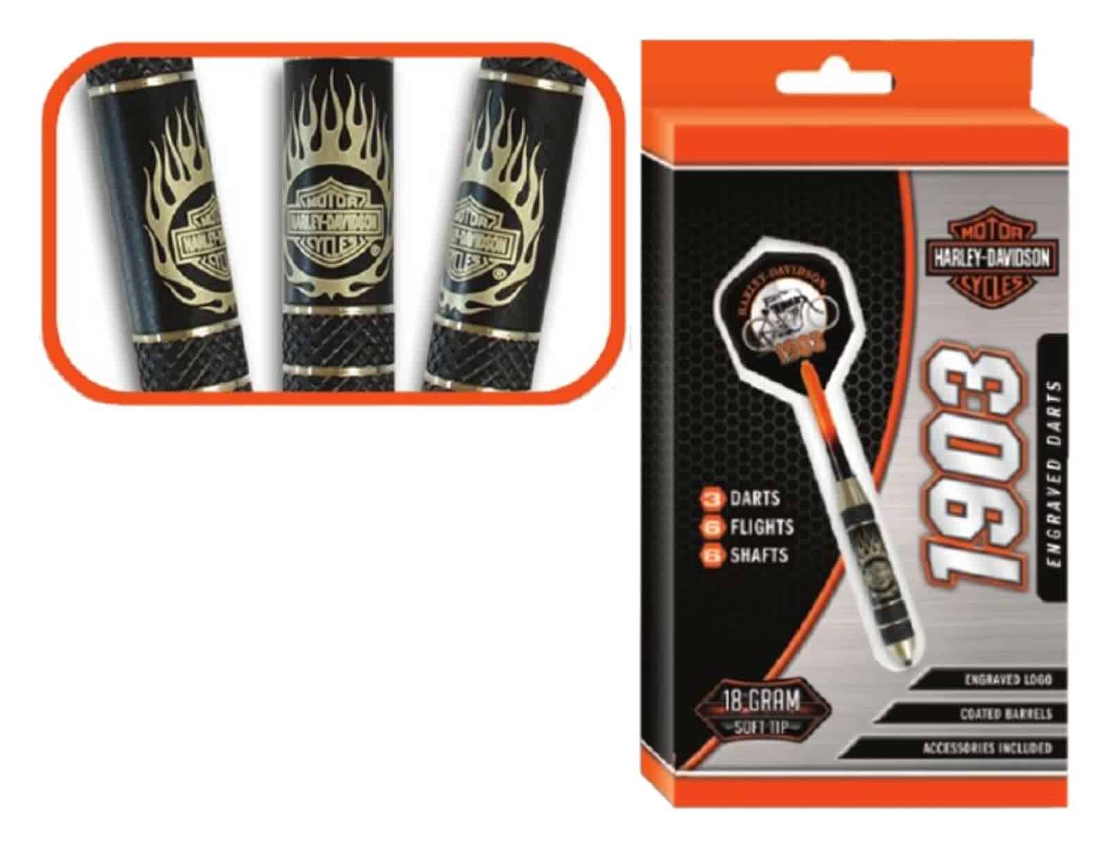 Dardos Suaves Harley-Davidson 1903, 61056. Barriles de níquel negro recubiertos de 18 gramos con diseño de logo de Bar & Shield grabado con láser. Presenta un gráfico de motocicleta vintage en vuelos negros. Incluye 3 dardos de punta suave con 6 vuelos y 6 ejes adicionales. ¡Los dardos perfectos para tu tablero en casa!